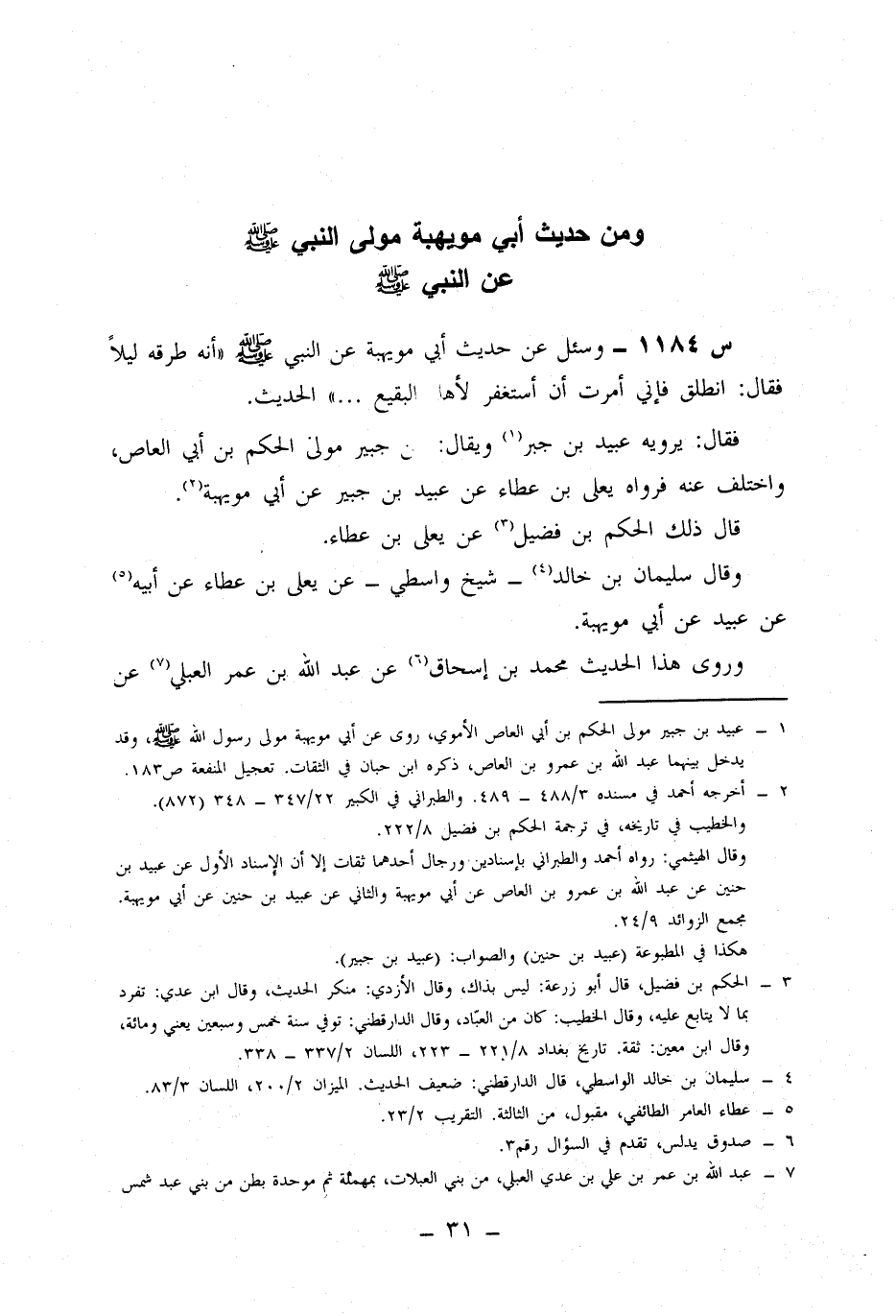 1184- وَسُئِلَ عَنْ حَدِيثِ أَبِي مُوَيْهِبَةَ، عن النبي صلى الله عليه وسلم؛ إنه طَرَقَهُ لَيْلًا، فَقَالَ: انْطَلِقْ فَإِنِّي أُمِرْتُ أَنْ أَسْتَغْفِرَ لِأَهْلِ الْبَقِيعِ.... الْحَدِيثَ.