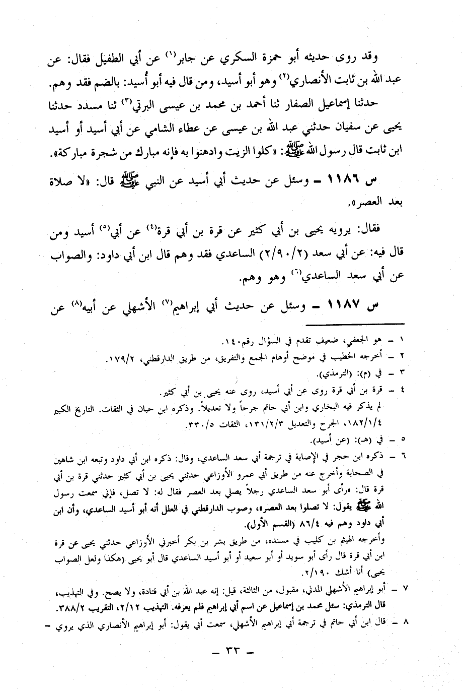1186- وَسُئِلَ عَنْ حَدِيثِ أَبِي أَسِيدٍ، عَنِ النَّبِيِّ صَلَّى اللَّهُ عَلَيْهِ وَسَلَّمَ، قَالَ: لَا صَلَاةَ بَعْدَ الْعَصْرِ.