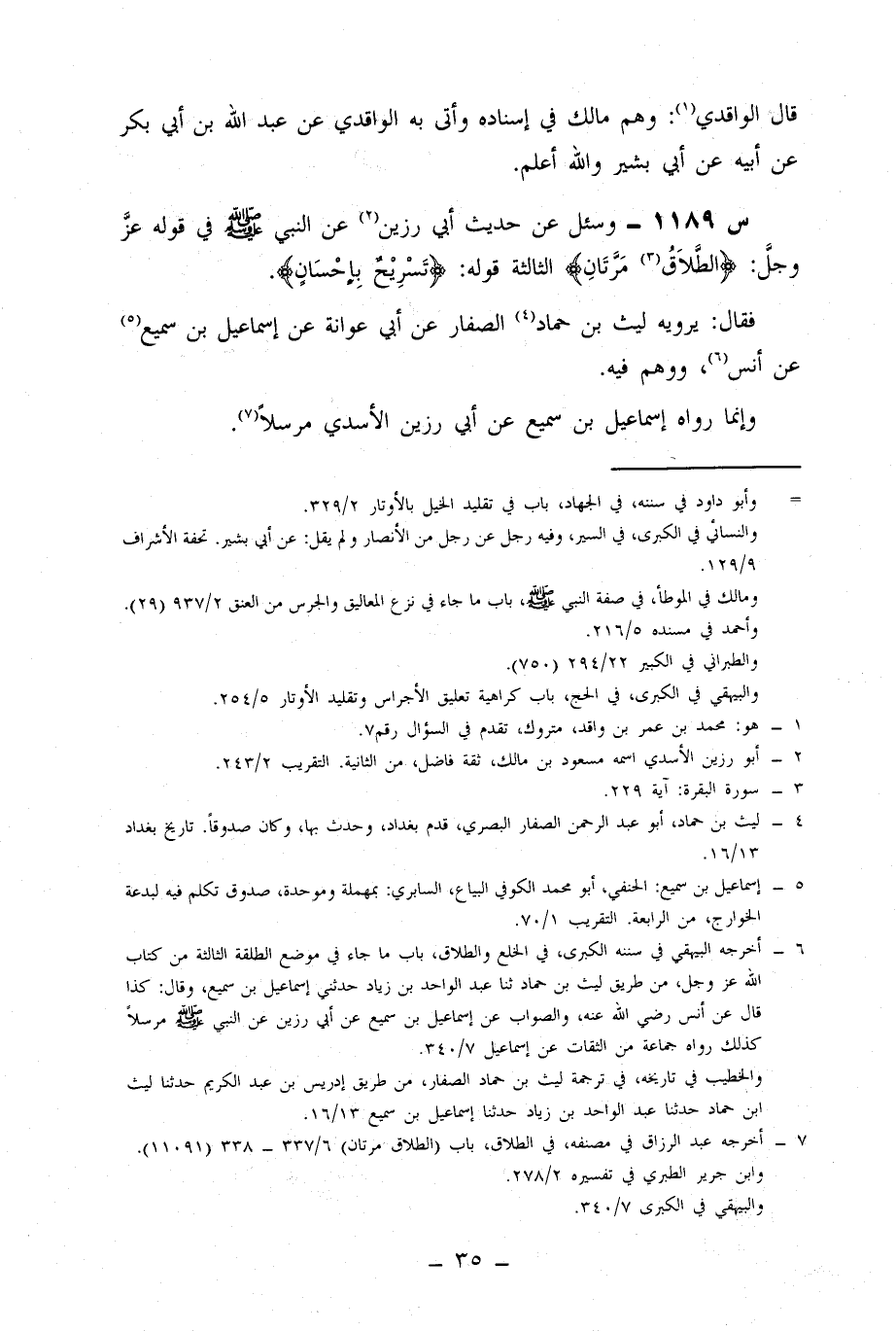 1189- وَسُئِلَ عَنْ حَدِيثِ أَبِي رَزِينٍ، عَنِ النَّبِيِّ صَلَّى اللَّهُ عَلَيْهِ وَسَلَّمَ فِي قَوْلِهِ عَزَّ وجل: {الطلاق مرتان} الثالثة قوله: {تسريح بإحسان} .