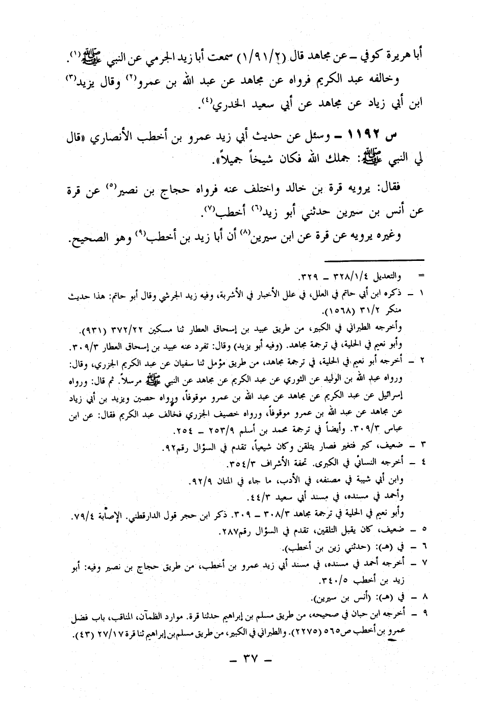 1192- وَسُئِلَ عَنْ حَدِيثِ أَبِي زَيْدٍ عَمْرِو بْنِ أَخْطَبَ الْأَنْصَارِيِّ قَالَ لِيَ النَّبِيُّ صَلَّى اللَّهُ عَلَيْهِ وَسَلَّمَ: جَمَّلَكَ اللَّهُ، فَكَانَ شَيْخًا جَمِيلًا.