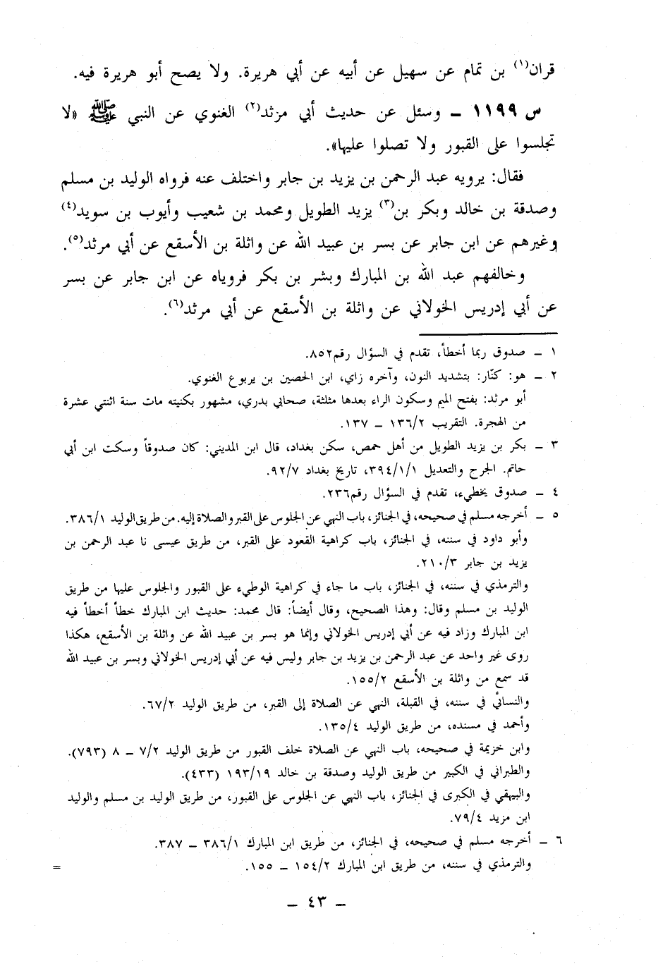 1199- وَسُئِلَ عَنْ حَدِيثِ أَبِي مَرْثَدٍ الْغَنَوِيِّ، عَنِ النَّبِيِّ صَلَّى اللَّهُ عَلَيْهِ وَسَلَّمَ: لَا تَجْلِسُوا عَلَى الْقُبُورِ وَلَا تُصَلُّوا عَلَيْهَا.