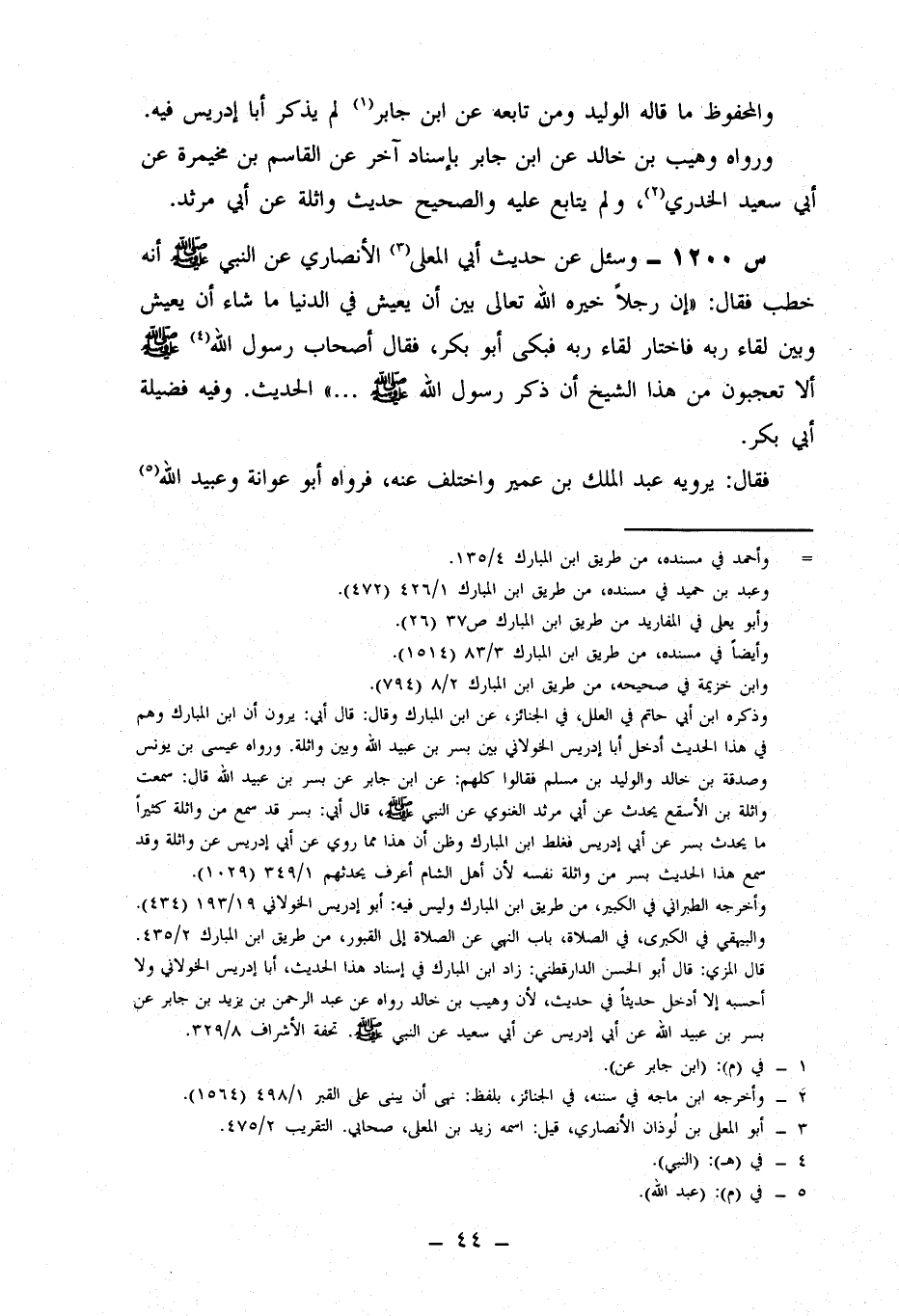 1200- وَسُئِلَ عَنْ حَدِيثِ أَبِي الْمُعَلَّى الْأَنْصَارِيِّ، عَنِ النَّبِيِّ صَلَّى اللَّهُ عَلَيْهِ وَسَلَّمَ، أَنَّهُ خَطَبَ، فَقَالَ: إِنَّ رَجُلًا خَيَّرَهُ اللَّهُ تَعَالَى بَيْنَ أَنْ يَعِيشَ فِي الدُّنْيَا مَا شَاءَ أَنْ يَعِيشَ وَبَيْنَ لِقَاءِ رَبِّهِ فَاخْتَارَ لِقَاءَ رَبِّهِ فَبَكَى أَبُو بَكْرٍ، فَقَالَ أَصْحَابُ رَسُولِ اللَّهِ صَلَّى اللَّهُ عَلَيْهِ وَسَلَّمَ أَلَا تَعْجَبُونَ مِنْ هَذَا الشَّيْخِ أَنْ ذَكَرَ رَسُولَ اللَّهِ صَلَّى اللَّهُ عَلَيْهِ وَسَلَّمَ الْحَدِيثَ، وَفِيهِ فَضِيلَةُ أَبِي بَكْرٍ.