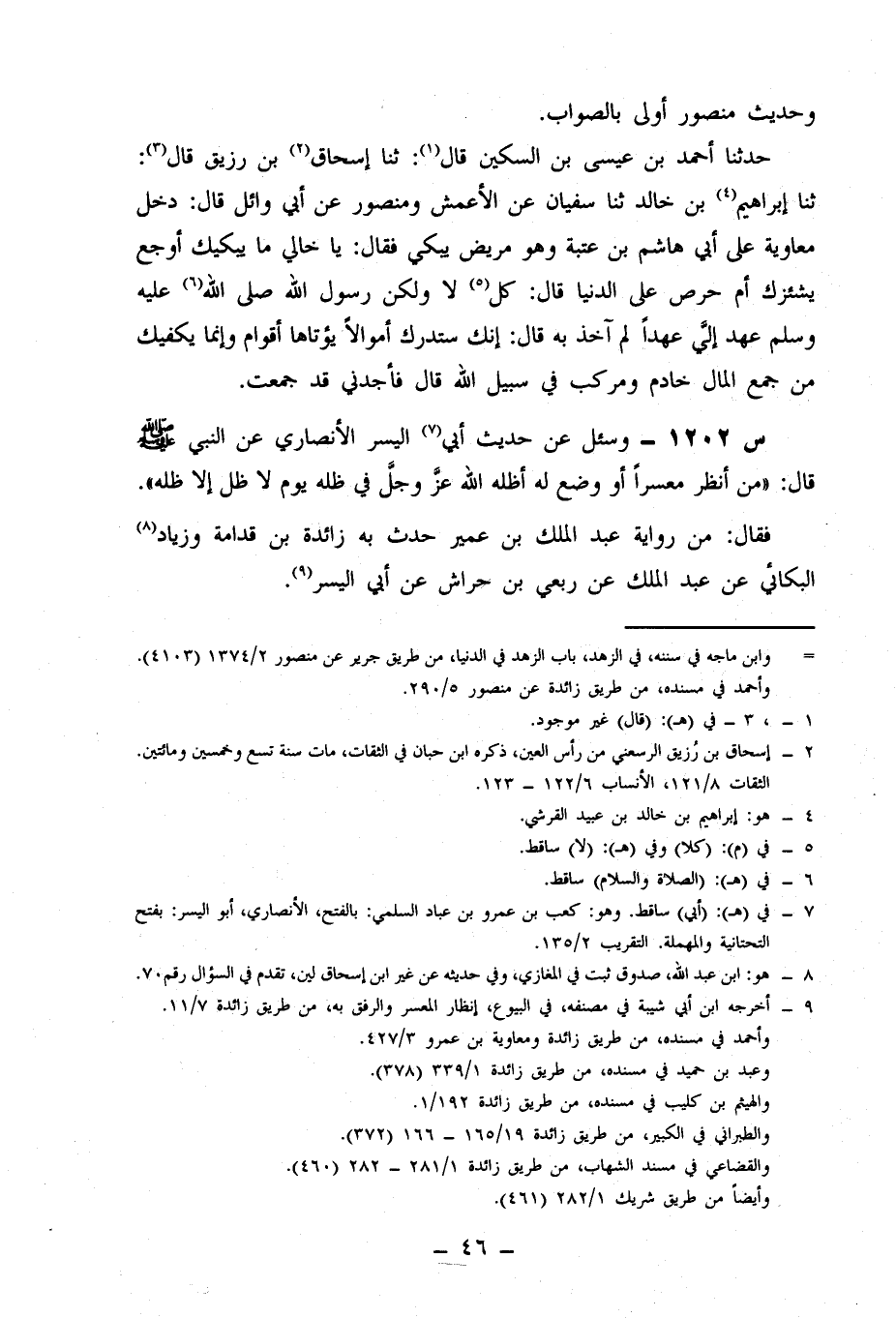 1202- وَسُئِلَ عَنْ حَدِيثِ أَبِي الْيَسَرِ الْأَنْصَارِيِّ، عَنِ النبي صلى الله عليه وسلم، قال: من أَنْظَرَ مُعْسِرًا أَوْ وَضَعَ لَهُ أَظَلَّهُ اللَّهُ عَزَّ وَجَلَّ فِي ظِلِّهِ يَوْمَ لَا ظِلَّ إِلَّا ظِلُّهُ.