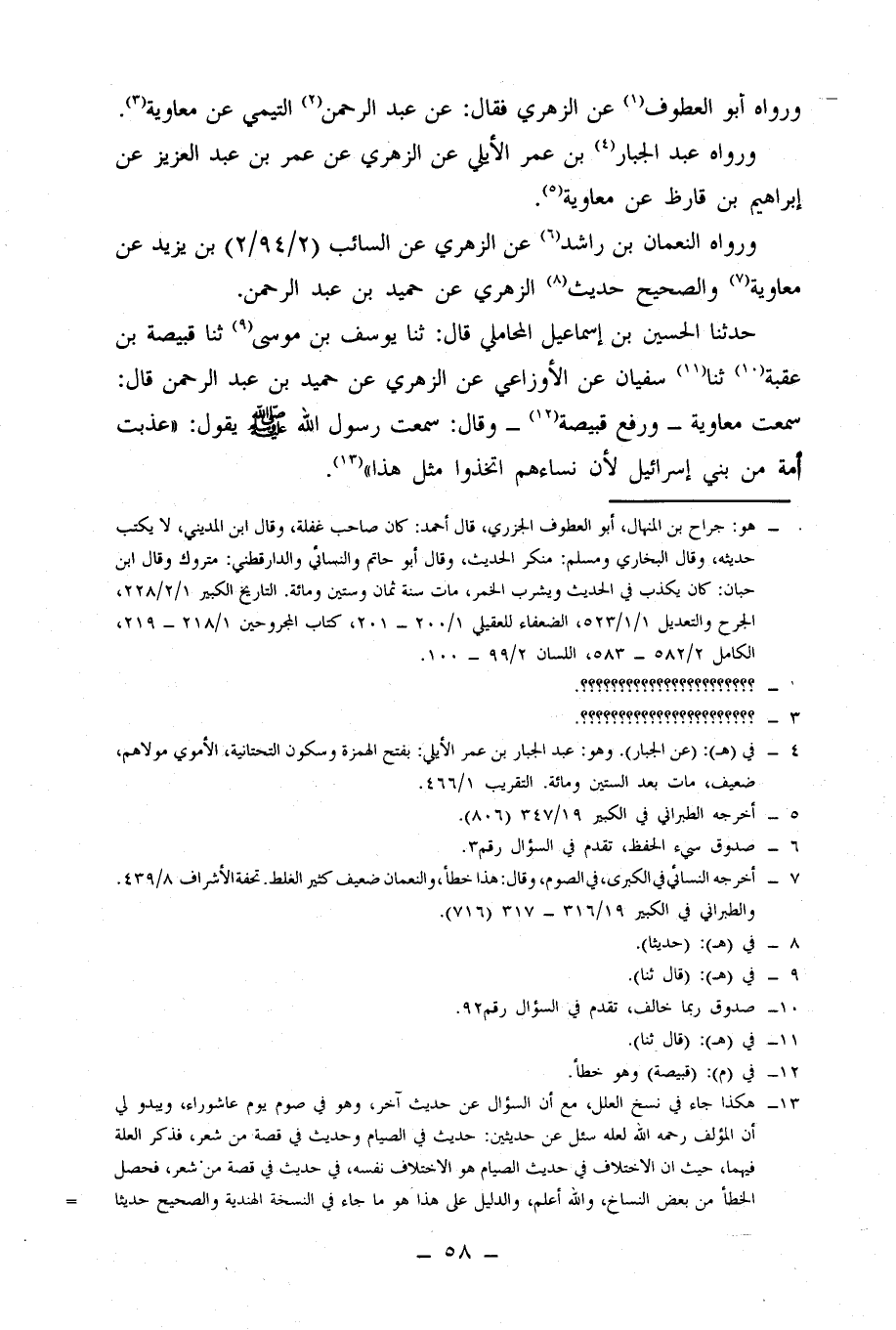 حَدَّثَنَا الْحُسَيْنُ بْنُ إِسْمَاعِيلَ المحاملي، قال: حدثنا يوسف بن موسى، حدثنا قبيصة بن عقبة، حدثنا سُفْيَانُ، عَنِ الْأَوْزَاعِيِّ، عَنِ الزُّهْرِيِّ، عَنْ حُمَيْدِ بْنِ عَبْدِ الرَّحْمَنِ، قَالَ: سَمِعْتُ مُعَاوِيَةَ، وَرَفَعَ قَبِيصَةُ، وَقَالَ: سَمِعْتُ رَسُولَ اللَّهِ صَلَّى اللَّهُ عَلَيْهِ وَسَلَّمَ، يَقُولُ: عُذِّبَتْ أُمَّةٌ مِنْ بَنِي إِسْرَائِيلَ لِأَنَّ نِسَاءَهُمُ اتَّخَذُوا مِثْلَ هَذَا.