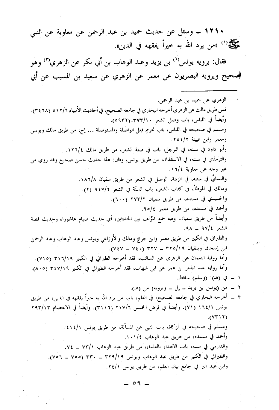 1210- وَسُئِلَ عَنْ حَدِيثِ حُمَيْدِ بْنِ عَبْدِ الرَّحْمَنِ، عن معاوية، عن النبي صلى الله عليه وَسَلَّمَ: مَنْ يُرِدِ اللَّهُ بِهِ خَيْرًا يُفَقِّهْهُ فِي الدِّينِ.