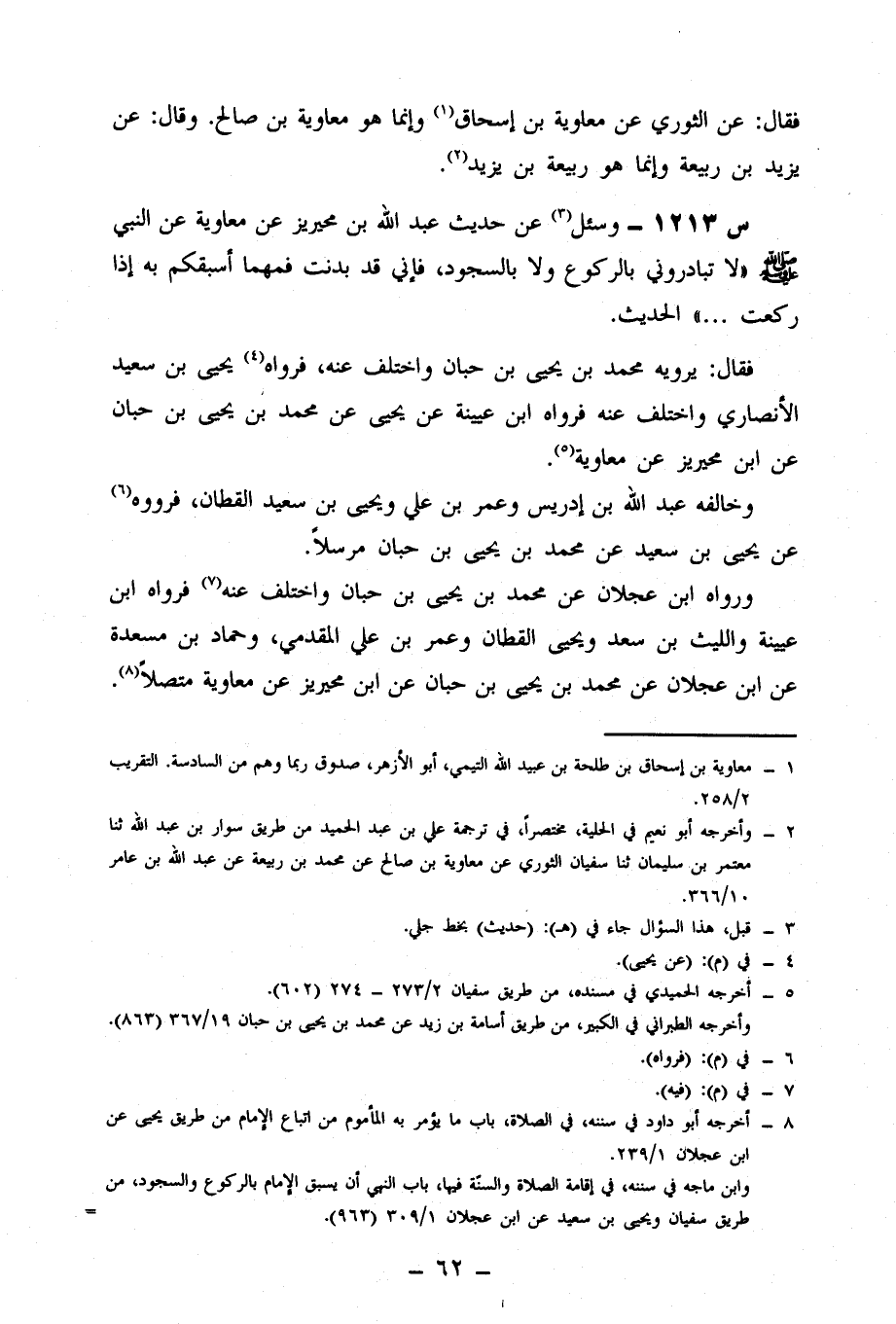 1213- وَسُئِلَ عَنْ حَدِيثِ عَبْدِ اللَّهِ بْنِ مُحَيْرِيزٍ، عن معاوية، عَنِ النَّبِيِّ صَلَّى اللَّهُ عَلَيْهِ وَسَلَّمَ: لَا تُبَادِرُونِي بِالرُّكُوعِ وَلَا بِالسُّجُودِ، فَإِنِّي قَدْ بَدُنْتُ فَمَهْمَا أَسْبِقُكُمْ بِهِ إِذَا رَكَعْتُ ... الْحَدِيثَ.