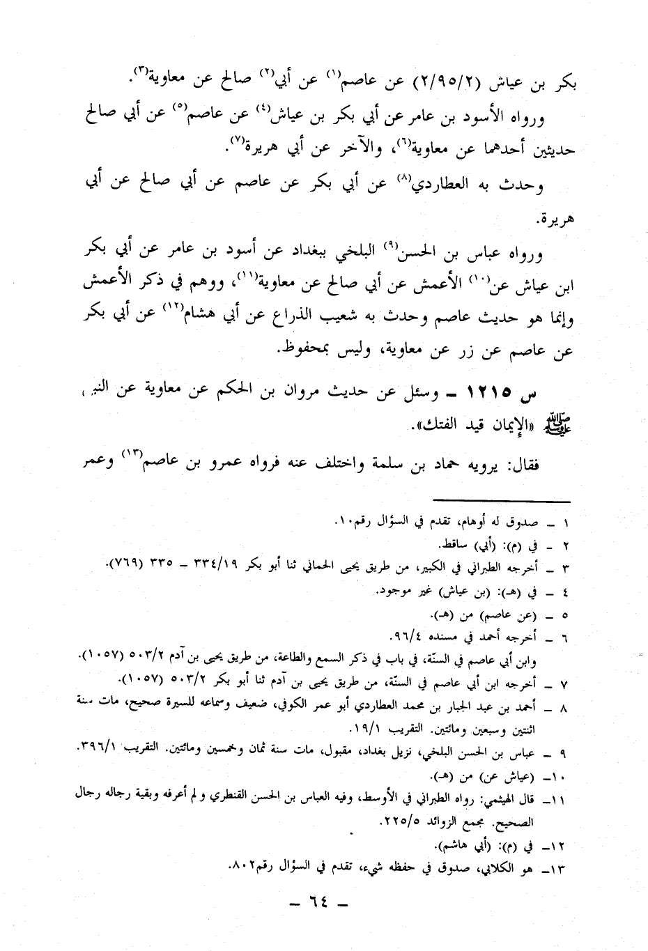 1215- وَسُئِلَ عَنْ حَدِيثِ مَرْوَانَ بْنِ الْحَكَمِ، عَنْ معاوية، عن النبي صلى الله عليه وسلم: الْإِيمَانُ قَيَّدَ الْفَتْكَ.