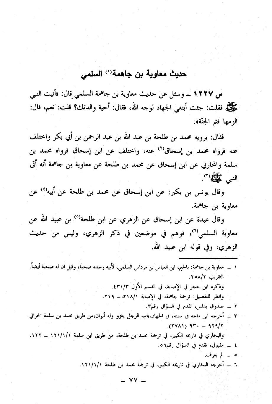 1227- وَسُئِلَ عَنْ حَدِيثِ مُعَاوِيَةَ بْنِ جَاهِمَةَ السُّلَمِيِّ، قَالَ أَتَيْتُ النَّبِيَّ صَلَّى اللَّهُ عَلَيْهِ وَسَلَّمَ، فَقُلْتُ: جِئْتُ أَبْتَغِي الْجِهَادَ لِوَجْهِ اللَّهِ، فَقَالَ: أَحَيَّةٌ وَالِدَتُكَ؟ قُلْتُ: نَعَمْ، قَالَ: الْزَمْهَا فَثَمَّ الْجَنَّةُ.
