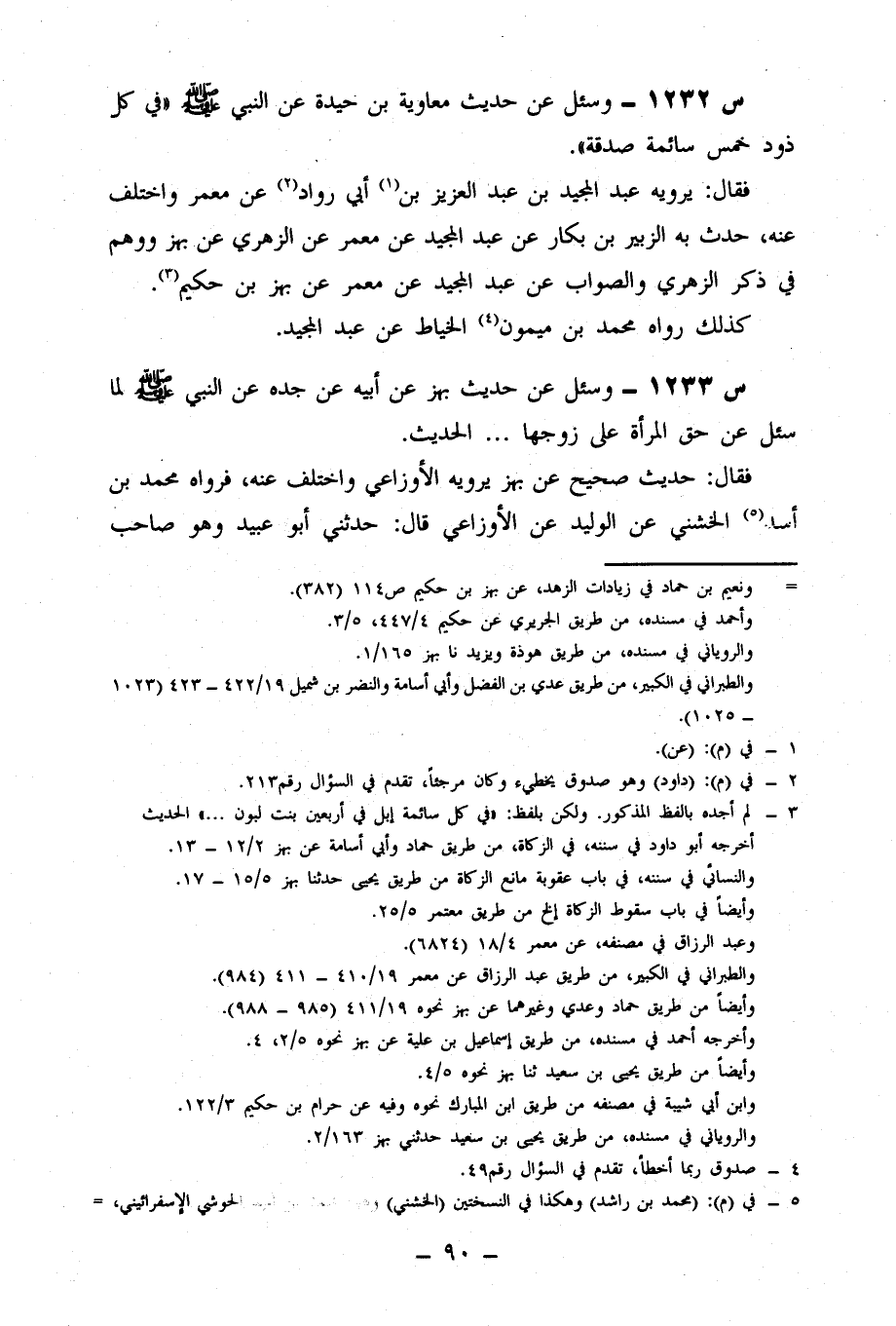 1232- وَسُئِلَ عَنْ حَدِيثِ مُعَاوِيَةَ بْنِ حَيْدَةَ، عَنِ النَّبِيِّ صَلَّى اللَّهُ عليه وسلم؛ في كل ذَوْدٍ خَمْسُ سَائِمَةٍ صَدَقَةً.