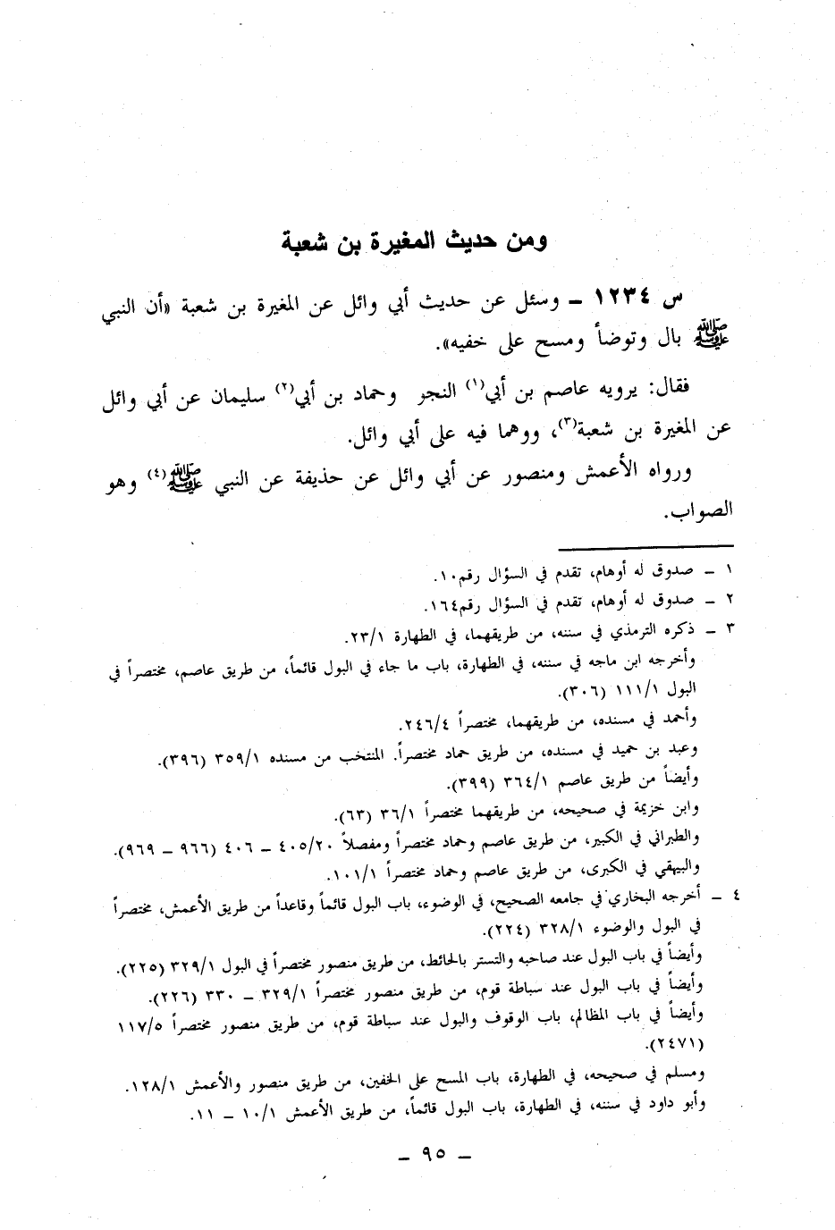 1234- وَسُئِلَ عَنْ حَدِيثِ أَبِي وَائِلٍ، عَنِ الْمُغِيرَةِ بْنِ شُعْبَةَ أَنَّ النَّبِيَّ صَلَّى اللَّهُ عَلَيْهِ وَسَلَّمَ بَالَ وَتَوَضَّأَ وَمَسَحَ عَلَى خُفَّيْهِ.