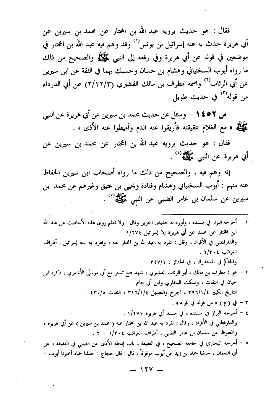 1452- وَسُئِلَ عَنْ حَدِيثِ مُحَمَّدِ بْنِ سِيرِينَ، عَنْ أَبِي هُرَيْرَةَ، عَنِ النَّبِيِّ صَلَّى الله عليه وَسَلَّمَ: مَعَ الْغُلَامِ عَقِيقَتُهُ، فَأَرِيقُوا عَنْهُ الدَّمَ، وَأَمِيطُوا عَنْهُ الْأَذَى.