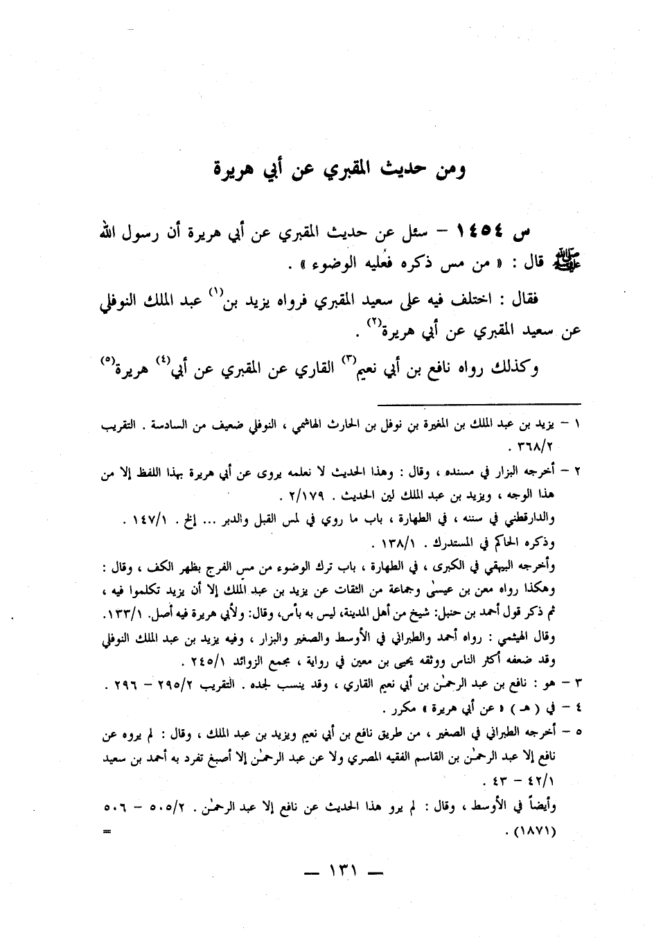 1454- سُئِلَ عن حديث المقبري، عن أبي هريرة، أن رسول الله صلى الله عليه وسلم قال: مَنْ مَسَّ ذَكَرَهُ، فَعَلَيْهِ الْوُضُوءُ.