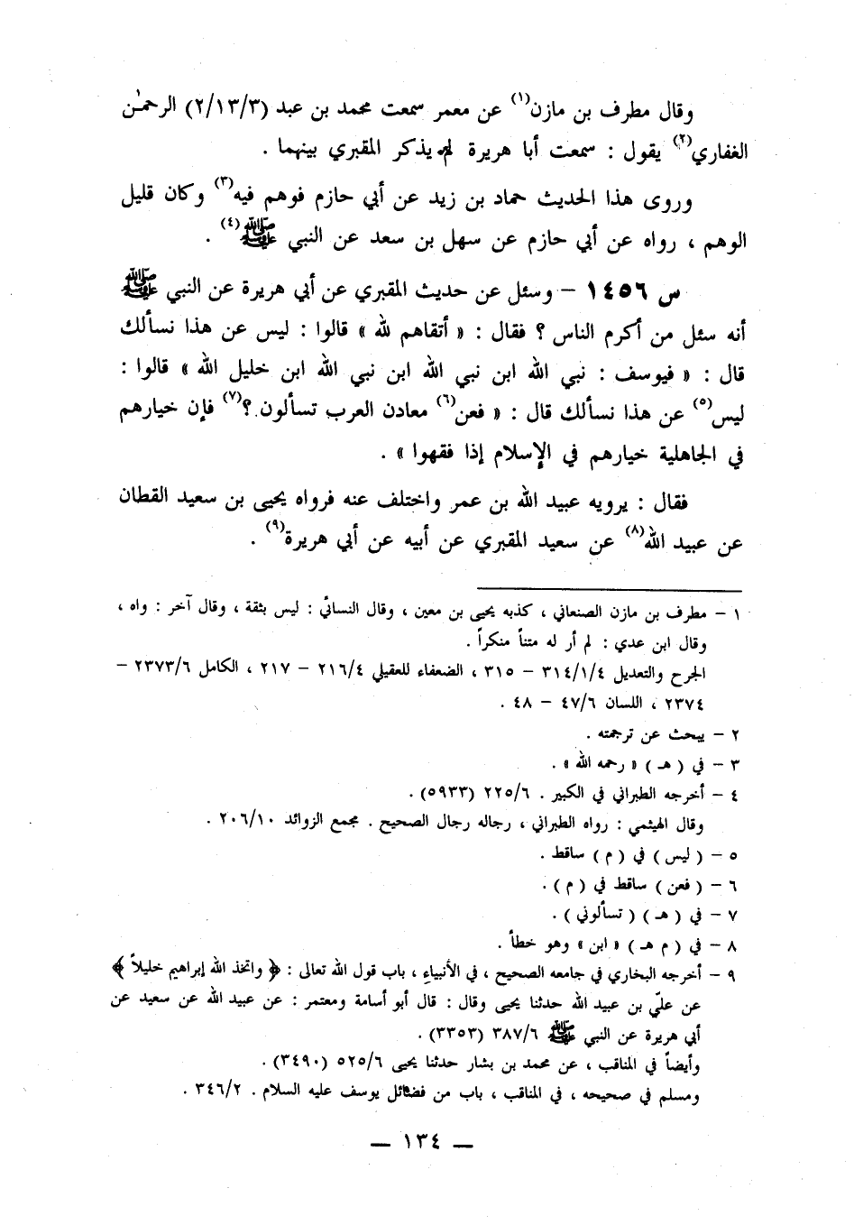 1456- وسئل عن حديث المقبري، عن أبي هريرة، عن النبي صلى الله عليه وسلم؛ إنه سُئِلَ مَنْ أَكْرَمُ النَّاسِ؟ فَقَالَ: أَتْقَاهُمْ للَّهِ، قَالُوا: لَيْسَ عَنْ هَذَا نَسْأَلُكَ، قَالَ: فَيُوسُفُ نَبِيُّ اللَّهِ ابْنُ نَبِيِّ اللَّهِ ابْنُ نَبِيِّ اللَّهِ ابْنُ خَلِيلِ اللَّهِ، قَالُوا: لَيْسَ عَنْ هَذَا نَسْأَلُكَ، قَالَ: فَعَنْ مَعَادِنِ الْعَرَبِ تَسْأَلُونَ؟ فَإِنَّ خِيَارَهُمْ فِي الْجَاهِلِيَّةِ خِيَارُهُمْ فِي الْإِسْلَامِ، إِذَا فَقِهُوا.