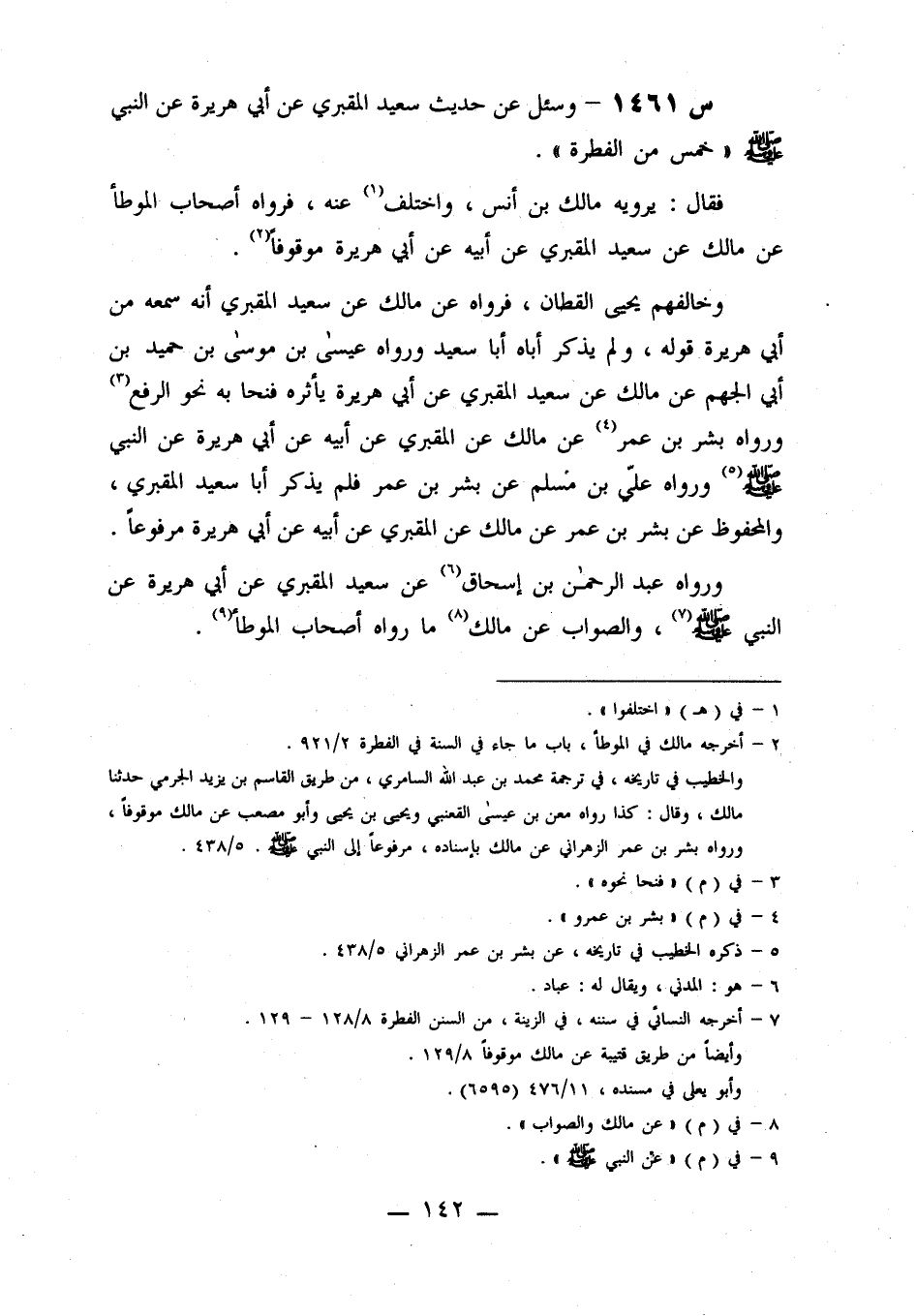 1461- وسئل عن حديث سعيد المقبري، عن أبي هريرة، عن النبي صلى الله عليه وسلم: خَمْسٌ مِنَ الْفِطْرَةِ.