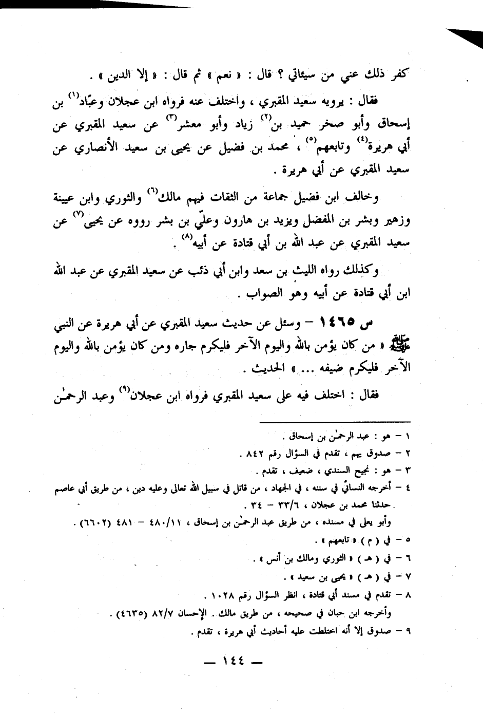 1464- وَسُئِلَ عَنْ حَدِيثٍ رُوِيَ عَنْ سَعِيدٍ الْمَقْبُرِيِّ، عَنْ أَبِي هُرَيْرَةَ، أَنَّ رَجُلًا أُتِيَ رَسُولُ اللَّهِ صَلَّى اللَّهُ عَلَيْهِ وَسَلَّمَ، فَقَالَ: أَرَأَيْتَ إِنْ قَاتَلْتُ صَابِرًا مُحْتَسِبًا مُقْبِلًا، كَفَّرَ ذَلِكَ عَنِّي مِنْ سَيِّئَاتِي؟ قَالَ: نَعَمْ، ثُمَّ قَالَ: إِلَّا الدَّيْنِ.