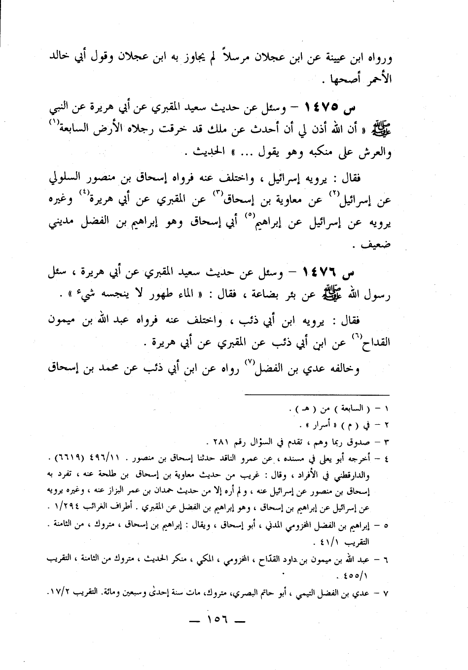 1475- وسئل عن حديث سعيد المقبري، عن أبي هريرة، عن النبي صلى الله عليه وسلم: أَنَّ اللَّهَ أَذِنَ لِي أَنْ أُحَدِّثَ عَنْ مَلَكٍ قَدْ خَرَقَتْ رِجْلَاهُ الْأَرْضَ السَّابِعَةَ، وَالْعَرْشُ عَلَى مَنْكِبِهِ، وَهُوَ يَقُولُ ... الْحَدِيثَ.