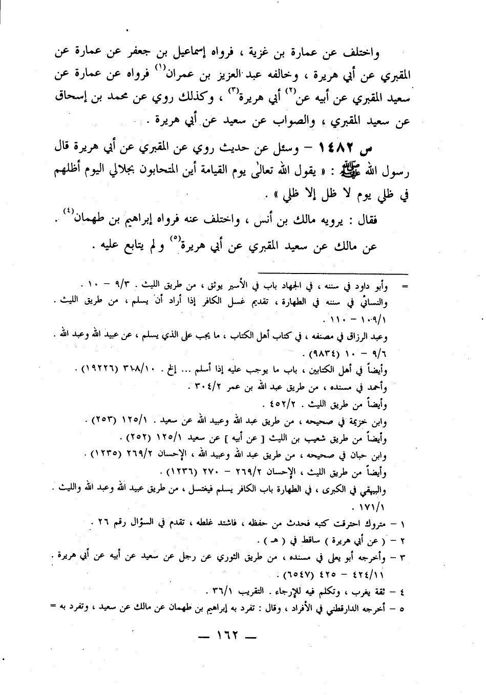 1482- وَسُئِلَ عَنْ حَدِيثٍ رُوِيَ عَنِ الْمَقْبُرِيِّ، عَنْ أبي هريرة، قال رسول الله صلى الله عَلَيْهِ وَسَلَّمَ: يَقُولُ اللَّهُ تَعَالَى يَوْمَ الْقِيَامَةِ: أَيْنَ الْمُتَحَابُّونَ بِجَلَالِي؟ الْيَومَ أُظِلُّهُمْ فِي ظِلِّي، يَوْمَ لَا ظِلَّ إِلَّا ظِلِّي.