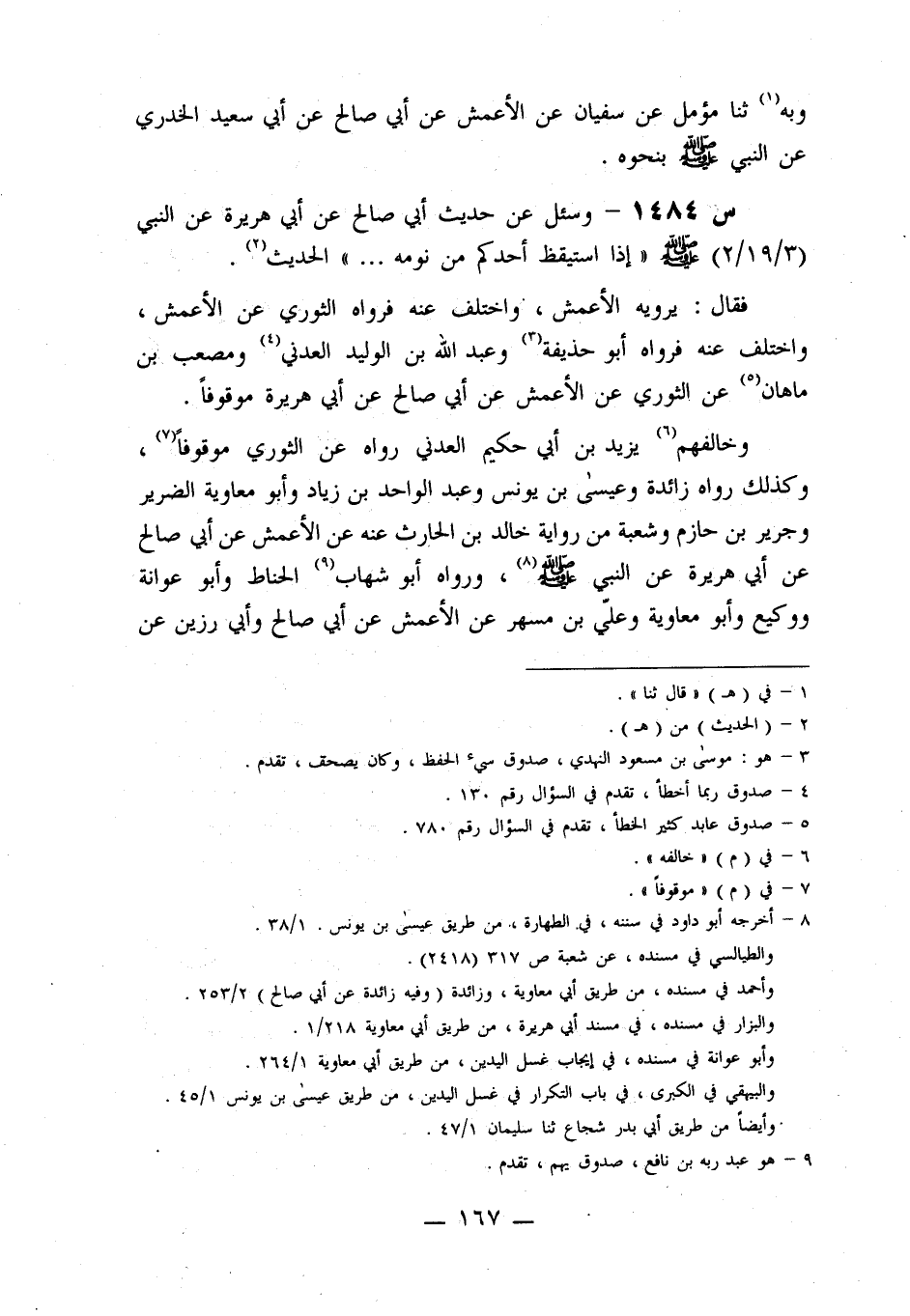 1484- وَسُئِلَ عَنْ حَدِيثِ أَبِي صَالِحٍ، عَنْ أَبِي هريرة، عن النبي صلى الله عليه وَسَلَّمَ: إِذَا اسْتَيْقَظَ أَحْدُكُمْ مِنْ نَوْمِهِ ... الْحَدِيثَ.