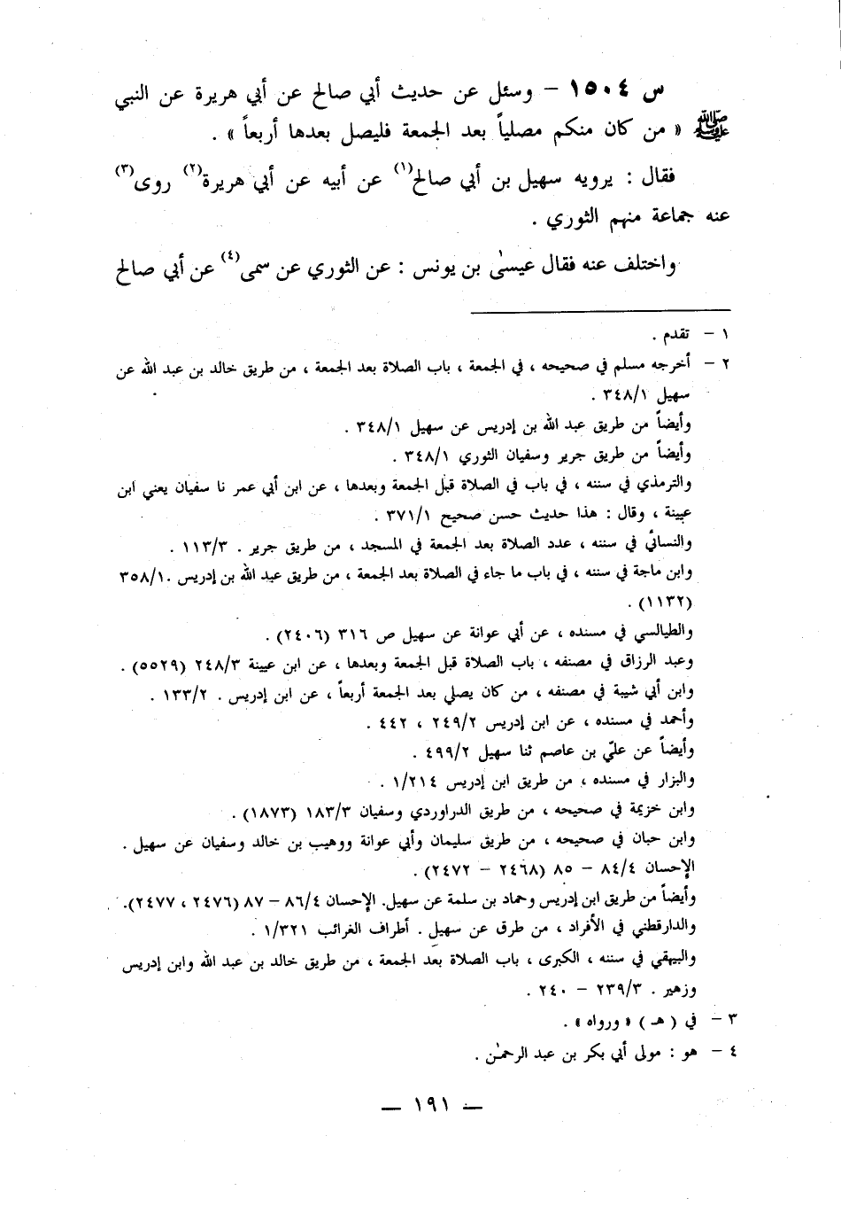 1504- وَسُئِلَ عَنْ حَدِيثِ أَبِي صَالِحٍ، عَنْ أَبِي هريرة، عن النبي صلى الله عليه وسلم: مَنْ كَانَ مِنْكُمْ مُصَلِّيًا بَعْدَ الْجُمُعَةِ، فَلْيُصَلِّ بَعْدَهَا أَرْبَعًا.
