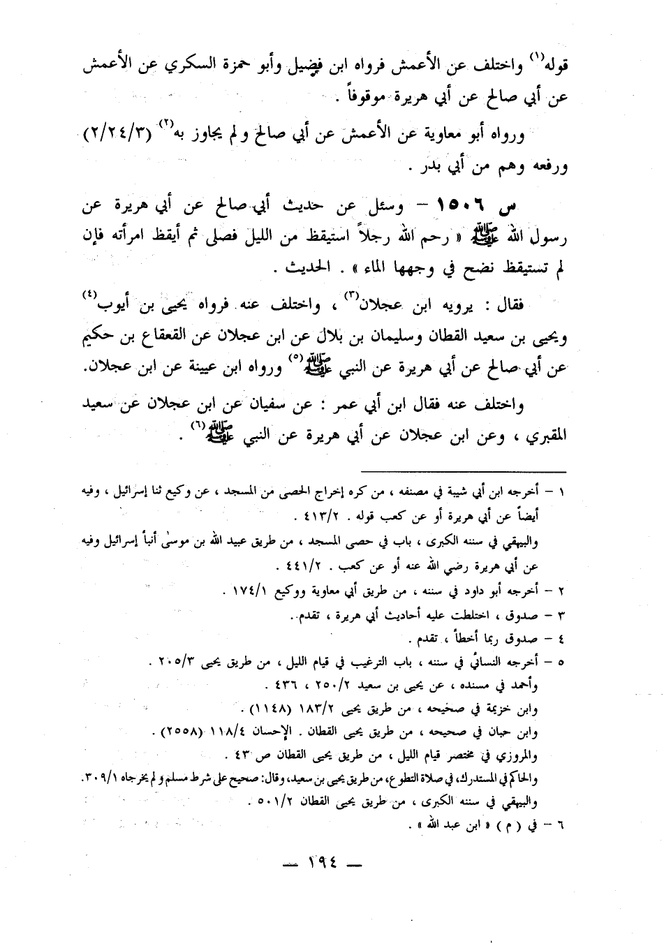 1506- وَسُئِلَ عَنْ حَدِيثِ أَبِي صَالِحٍ، عَنْ أَبِي هُرَيْرَةَ، عَنْ رَسُولِ اللَّهِ صَلَّى اللَّهُ عَلَيْهِ وَسَلَّمَ: رَحِمَ اللَّهُ رَجُلًا اسْتَيْقَظَ مِنَ اللَّيْلِ، فَصَلَّى، ثُمَّ أَيْقَظَ امْرَأَتَهُ، فَإِنْ لَمْ تَسْتَيْقِظْ نَضَحَ فِي وَجْهِهَا الْمَاءَ، ... الْحَدِيثَ.