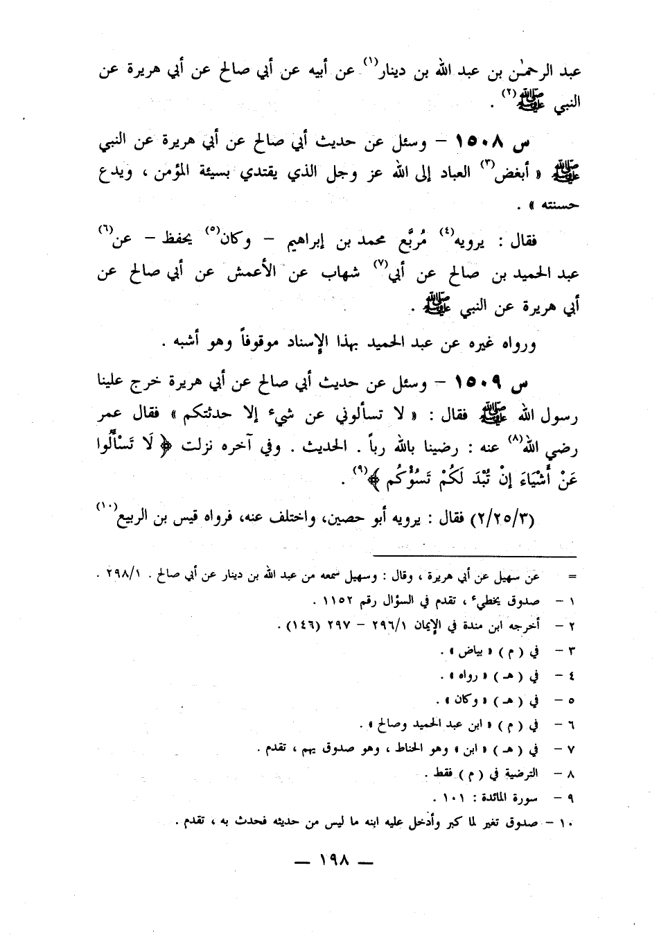 1509- وَسُئِلَ عَنْ حَدِيثِ أَبِي صَالِحٍ، عَنْ أَبِي هُرَيْرَةَ، خَرَجَ عَلَيْنَا رَسُولُ اللَّهِ صَلَّى اللَّهُ عَلَيْهِ وَسَلَّمَ، فَقَالَ: لَا تَسْأَلُونِي عَنْ شَيْءٍ إِلَّا حَدَّثْتُكُمْ، فَقَالَ عُمَرُ رَضِيَ اللَّهُ عَنْهُ: رَضَيْنَا بِاللَّهِ رَبًّا، الْحَدِيثَ، وَفِي آخِرِهِ نَزَلَتْ: {لا تَسْأَلُوا عَنْ أَشْيَاءَ إِنْ تُبْدَ لَكُمْ تسؤكم} .