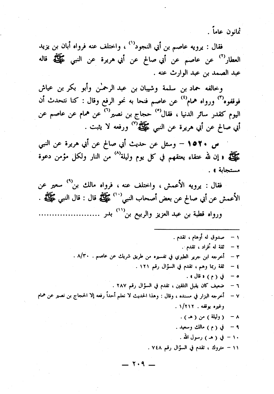 1520- وَسُئِلَ عَنْ حَدِيثِ أَبِي صَالِحٍ، عَنْ أَبِي هريرة، عن النبي صلى الله عليه وسلم: إِنَّ للَّهِ عُتَقَاءَ يَعْتِقُهُمْ فِي كُلِّ يَوْمٍ وَلَيْلَةٍ مِنَ النَّارِ، وَلِكُلِّ مُؤْمِنٍ دَعْوَةٌ مُسْتَجَابَةٌ.