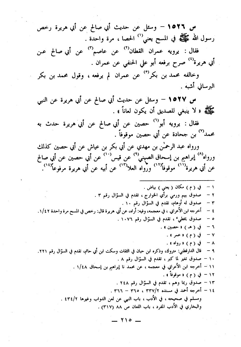 1526- وَسُئِلَ عَنْ حَدِيثِ أَبِي صَالِحٍ، عَنْ أَبِي هُرَيْرَةَ، رَخَّصَ رَسُولُ اللَّهِ صَلَّى اللَّهُ عَلَيْهِ وسلم في المسح، يعني الحصى مَرَّةً وَاحِدَةً.