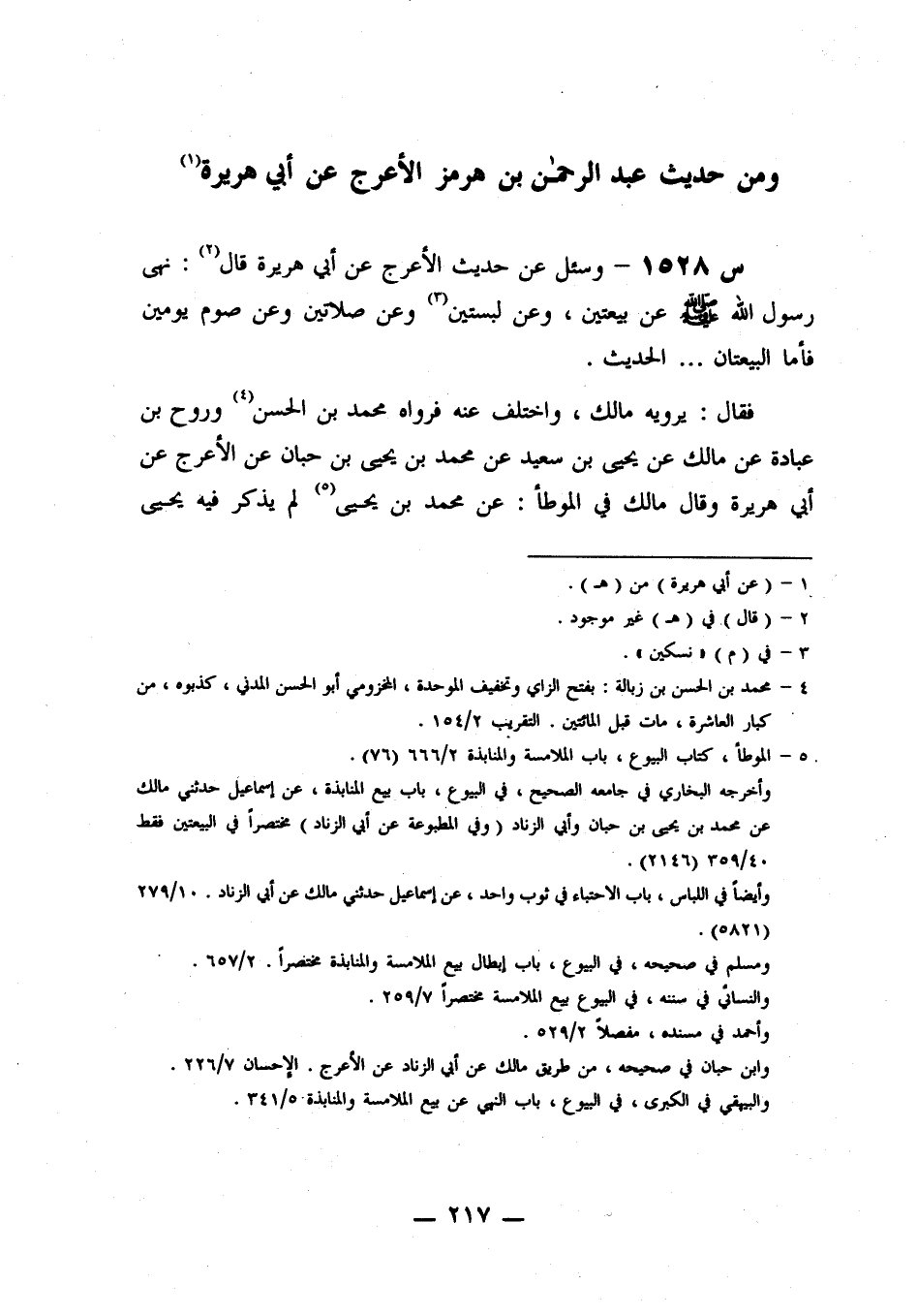 1528- وَسُئِلَ عَنْ حَدِيثِ الْأَعْرَجِ، عن أبي هريرة، قَالَ: نَهَى رَسُولُ اللَّهِ صَلَّى اللَّهُ عَلَيْهِ وَسَلَّمَ عَنْ بَيْعَتَيْنِ، وَعَنْ لِبْسَتَيْنِ، وَعَنْ صَلَاتَيْنِ، وَعَنْ صَوْمِ يَوْمَيْنِ، فَأَمَّا الْبَيْعَتَانِ ... الْحَدِيثَ.