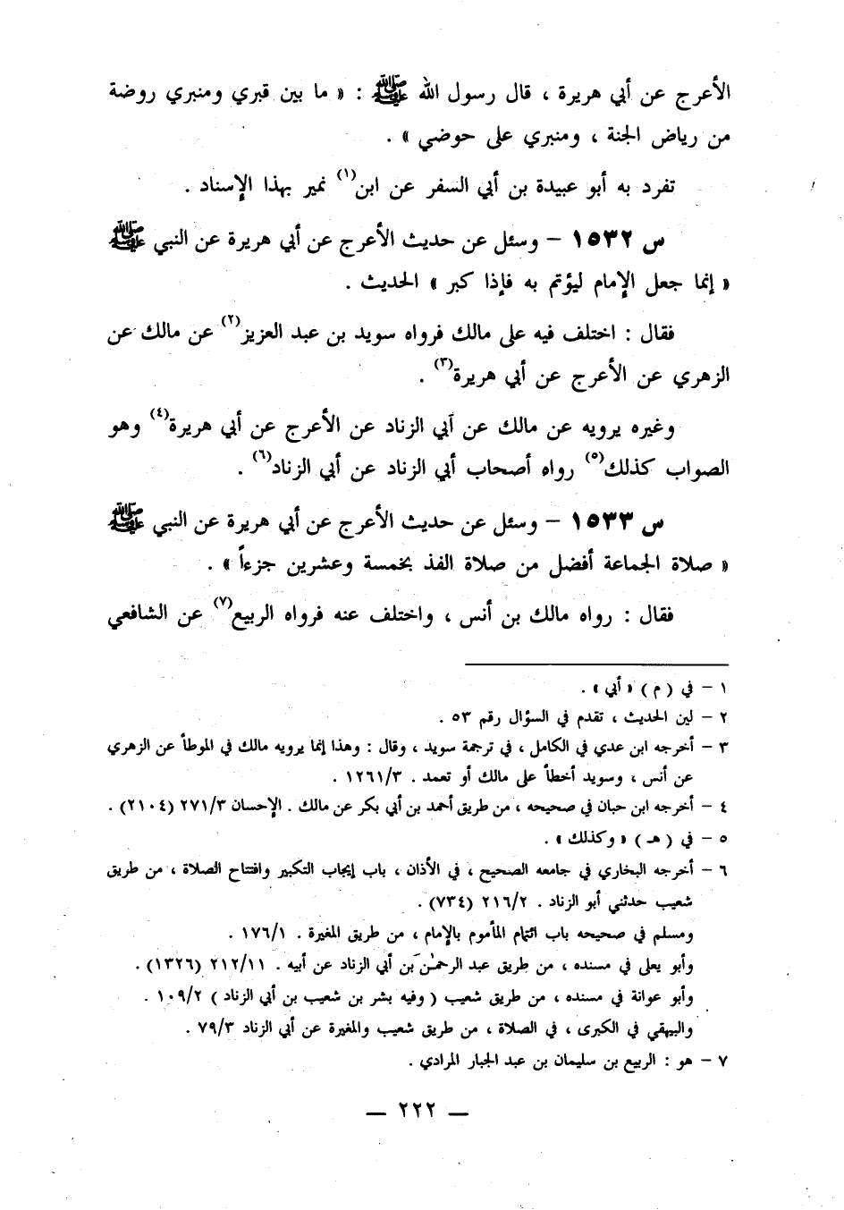 1533- وسئل عن حديث الْأَعْرَجِ، عَنْ أَبِي هُرَيْرَةَ، عَنِ النَّبِيِّ صَلَّى اللَّهُ عَلَيْهِ وَسَلَّمَ: صَلَاةُ الْجَمَاعَةِ أَفْضَلُ مِنْ صَلَاةِ الْفَذِّ بِخَمْسَةٍ وَعِشْرِينَ جُزْءًا.