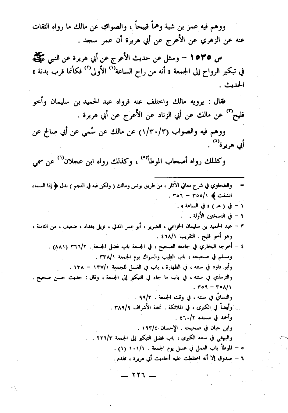 1535- وسئل عن حديث الْأَعْرَجِ، عَنْ أَبِي هُرَيْرَةَ، عَنِ النَّبِيِّ صَلَّى اللَّهُ عَلَيْهِ وَسَلَّمَ فِي تَبْكِيرِ الرَّوَاحِ إِلَى الْجُمُعَةِ، أَنَّهُ مَنْ رَاحَ السَّاعَةَ الْأُولَى، فَكَأَنَّمَا قَرَّبَ بَدَنَةً، ... الْحَدِيثَ.
