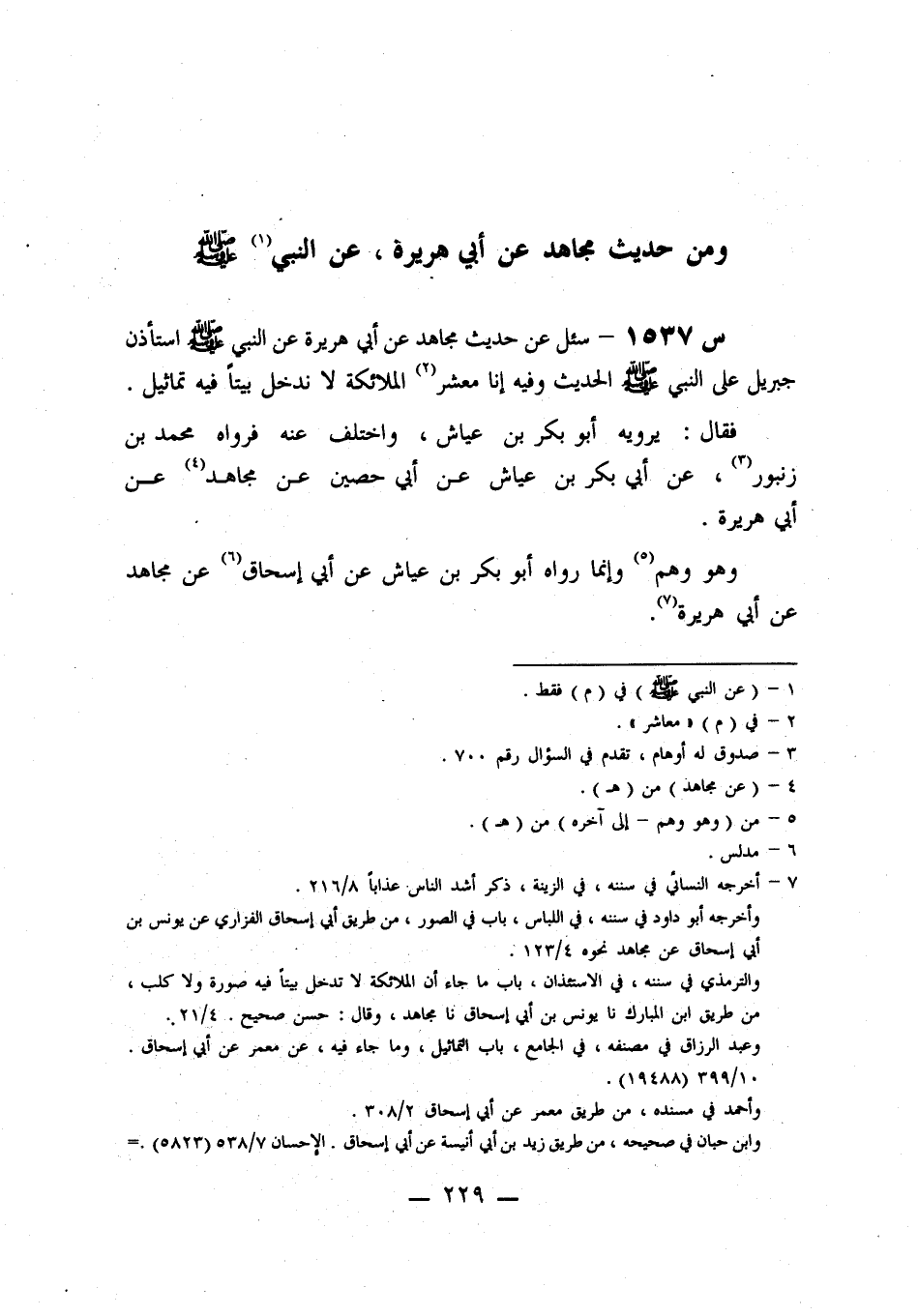1537- سئل عن حديث مجاهد، عن أبي هريرة، عن النبي صَلَّى اللَّهُ عَلَيْهِ وَسَلَّمَ، اسْتَأْذَنَ جِبْرِيلُ عَلَى النَّبِيِّ صَلَّى اللَّهُ عَلَيْهِ وَسَلَّمَ الْحَدِيثَ، وَفِيهِ: إِنَّا مَعْشَرَ الْمَلَائِكَةِ، لَا نَدْخُلُ بَيْتًا فِيهِ تَمَاثِيلٌ.