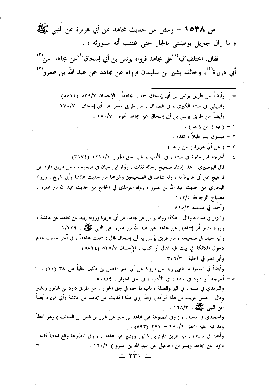 1538- وَسُئِلَ عَنْ حَدِيثِ مُجَاهِدٍ، عَنْ أَبِي هُرَيْرَةَ، عَنِ النَّبِيِّ صَلَّى اللَّهُ عَلَيْهِ وَسَلَّمَ: مَا زَالَ جِبْرِيلُ يُوصِينِي بِالْجَارِ، حَتَّى ظَنَنْتُ أَنَّهُ سَيُوَرِّثُهُ.