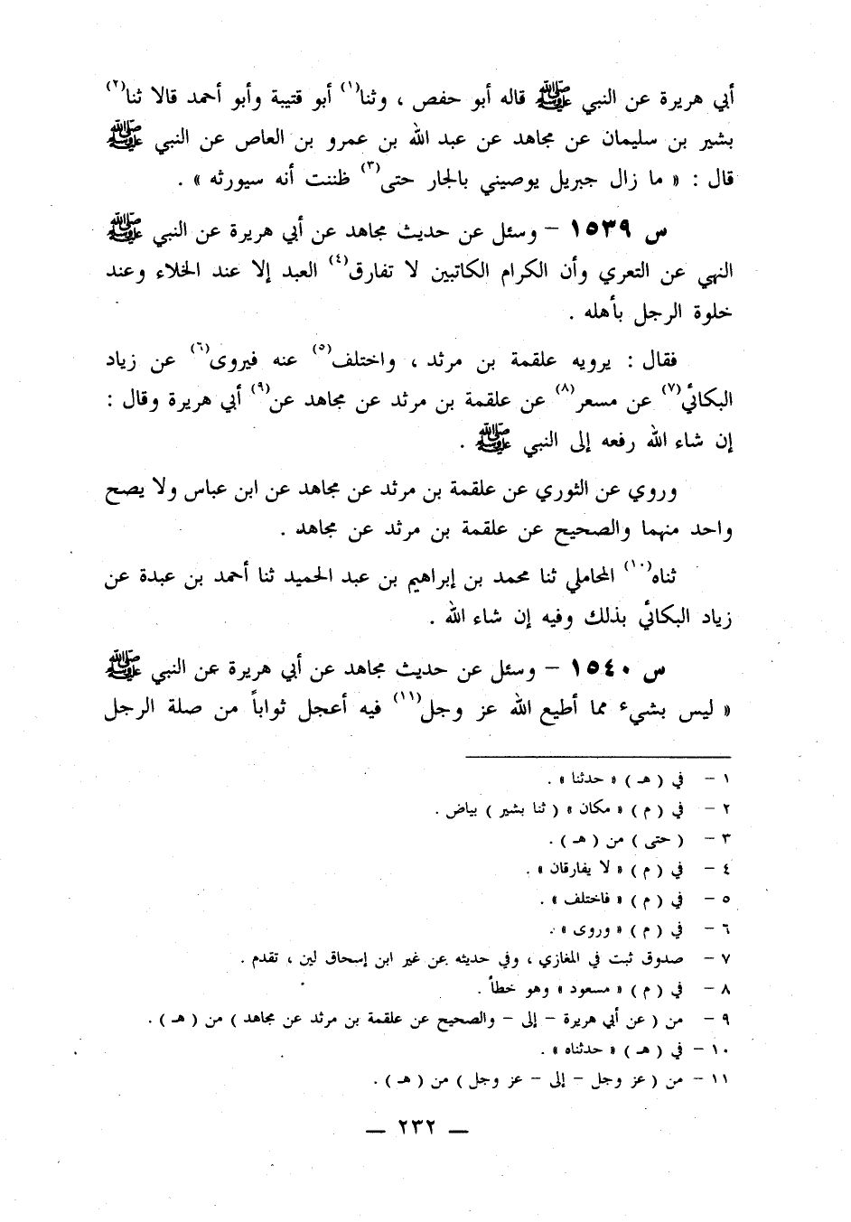 1539- وَسُئِلَ عَنْ حَدِيثِ مُجَاهِدٍ، عَنْ أَبِي هُرَيْرَةَ، عَنِ النَّبِيِّ صَلَّى اللَّهُ عَلَيْهِ وَسَلَّمَ، النَّهْيُ عَنِ التَّعَرِّي، وَأَنَّ الْكِرَامَ الْكَاتِبِينَ لَا تُفَارِقُ الْعَبْدَ، إِلَّا عِنْدَ الْخَلَاءِ، وَعِنْدُ خَلْوَةِ الرَّجُلِ بِأَهْلِهِ.