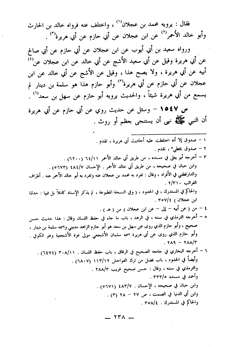 1546- وَسُئِلَ عَنْ حَدِيثٍ يُرْوَى عَنْ أَبِي حَازِمٍ، عن أبي هريرة، عن النبي صلى الله عَلَيْهِ وَسَلَّمَ: مَنْ وَقَاهُ اللَّهُ شَرَّ مَا بَيْنَ لَحْيَيْهِ، وَمَا بَيْنَ رِجْلَيْهِ، دَخَلَ الْجَنَّةَ.