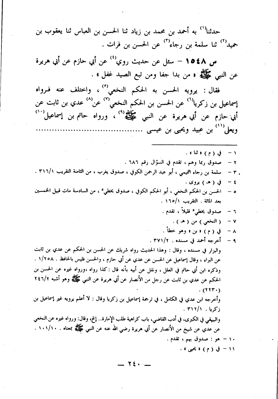 1548- سُئِلَ عَنْ حَدِيثٍ رُوِيَ عَنْ أَبِي حَازِمٍ، عن أبي هريرة، عن النبي صلى الله عَلَيْهِ وَسَلَّمَ: مَنْ بَدَا جَفَا، وَمَنْ تَبِعَ الصَّيْدَ غَفَلَ.
