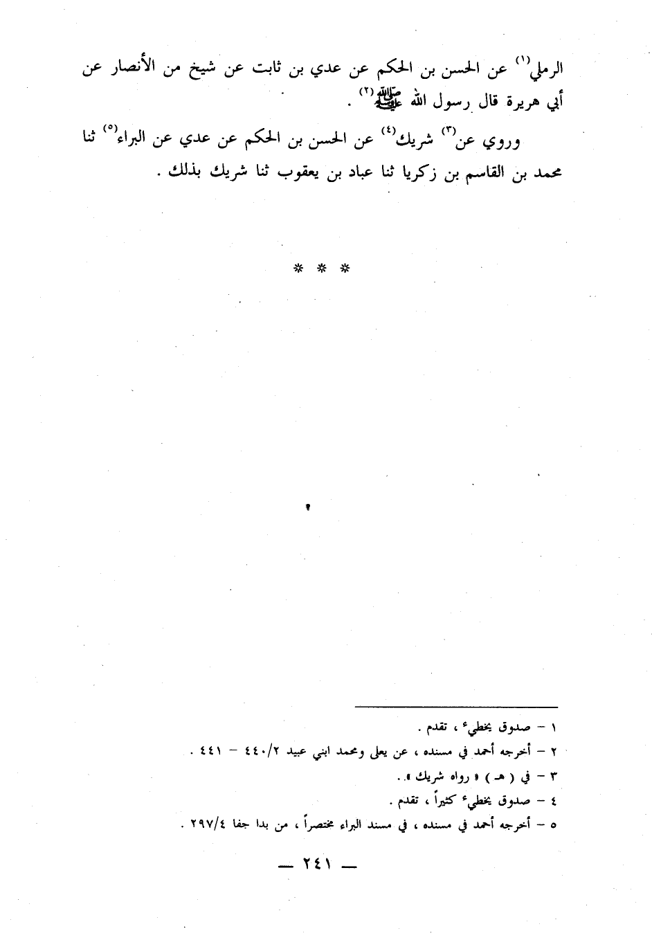 وَرُوِيَ عَنْ شَرِيكٍ، عَنِ الْحَسَنِ بْنِ الْحَكَمِ، عن عدي، عن البراء، حدثنا محمد بن القاسم بن زكريا، حدثنا عباد بن يعقوب، حدثنا شريك بذلك.