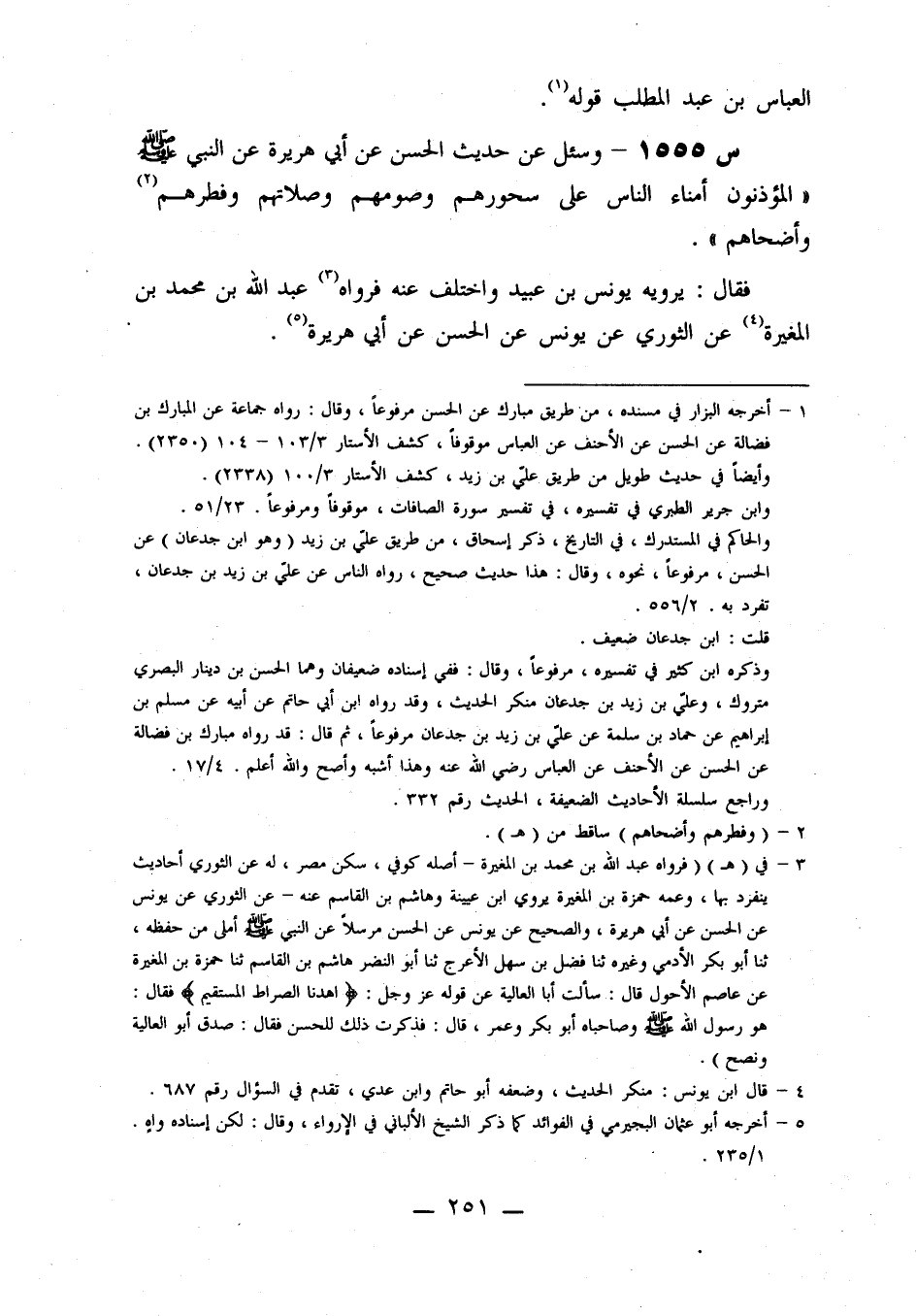 1555- وسئل عن حديث الحسن، عن أبي هريرة، عَنِ النَّبِيِّ صَلَّى اللَّهُ عَلَيْهِ وَسَلَّمَ: الْمُؤَذِّنُونَ أُمَنَاءُ النَّاسِ عَلَى سُحِورِهِمْ، وَصَوْمِهِمْ، وَصَلَاتِهِمْ، وَفِطْرِهِمْ، وَأُضْحَاهِمْ.