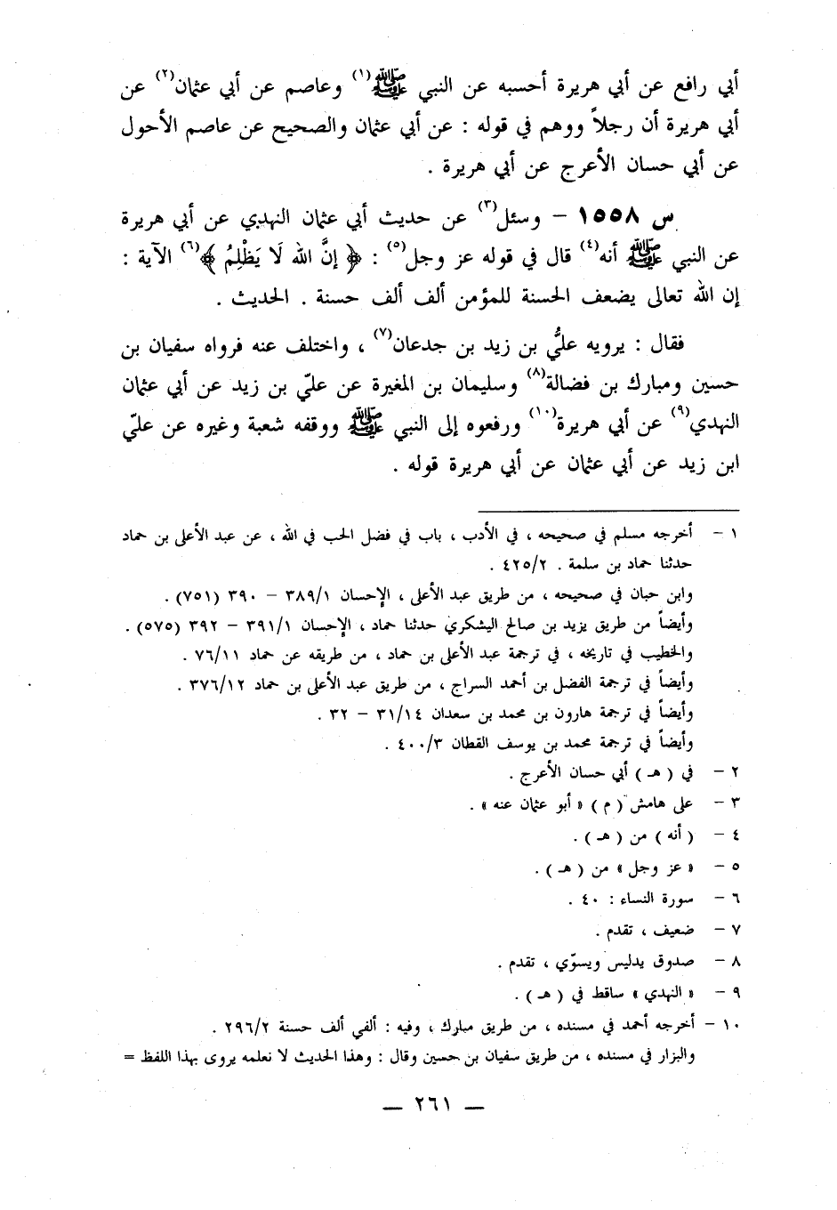 1558- وَسُئِلَ عَنْ حَدِيثِ أَبِي عُثْمَانَ النَّهْدِيِّ، عَنْ أبي هريرة، عن النبي صلى الله عليه وَسَلَّمَ، أَنَّهُ قَالَ فِي قَوْلِهِ عَزَّ وَجَلَّ: {إن الله لا يظلم} ، الْآيَةَ: إِنَّ اللَّهَ تَعَالَى يُضَعِّفُ الْحَسَنَةَ لِلْمُؤْمِنِ أَلْفَ أَلْفِ حَسَنَةٍ ... الْحَدِيثَ.