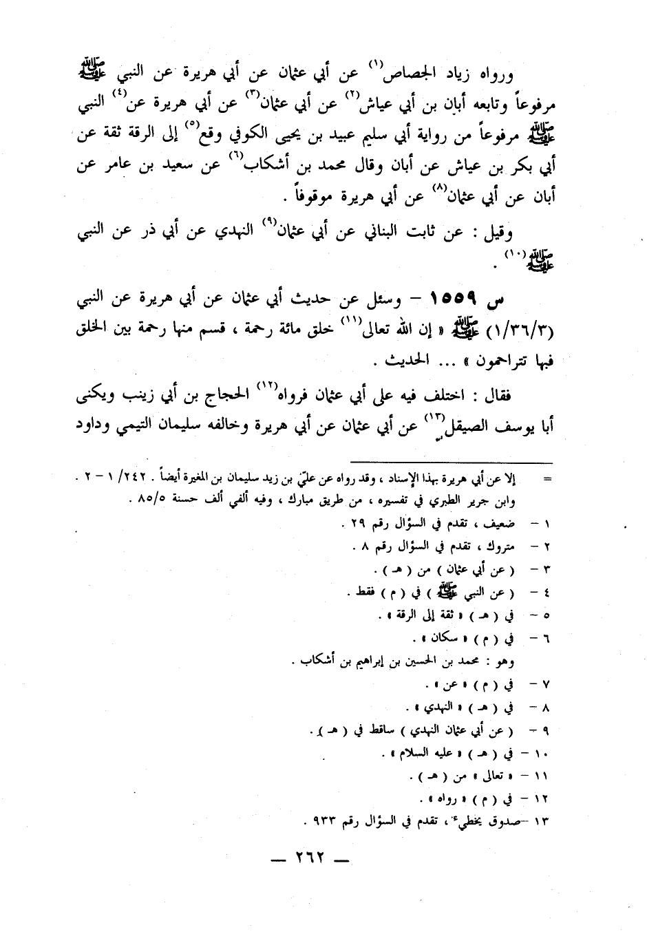 1559- وَسُئِلَ عَنْ حَدِيثِ أَبِي عُثْمَانَ، عَنْ أَبِي هريرة، عن النبي صلى الله عليه وسلم: إن الله تعالى خلق مئة رَحْمَةٍ، قَسَّمَ مِنْهَا رَحْمَةً بَيْنَ الْخَلْقِ، فِبِهَا تَتَرَاحَمُونَ ... الْحَدِيثَ.