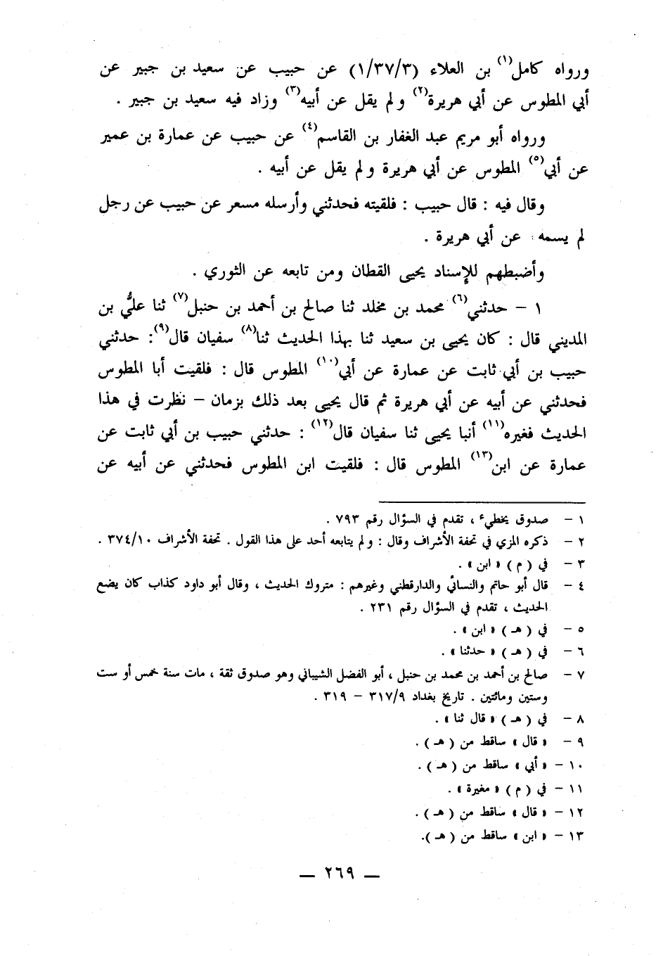 1ـ حَدَّثَنِي مُحَمَّدُ بْنُ مَخْلَدٍ، حدثنا صالح بن أحمد بن حنبل، حدثنا عَلِيُّ بْنُ الْمَدِينِيِّ، قَالَ: كَانَ يَحْيَى بْنُ سعيد حدثنا بهذا الحديث، حدثنا سُفْيَانُ، قَالَ: حَدَّثَنِي حَبِيبُ بْنُ أَبِي ثَابِتٍ، عَنْ عُمَارَةَ، عَنْ أَبِي الْمُطَوِّسِ، قَالَ: فَلَقَيْتُ أَبَا الْمُطَوِّسِ فَحَدَّثَنِي، عَنْ أَبِيهِ، عَنْ أَبِي هُرَيْرَةَ، ثُمّ قَالَ يَحْيَى بَعْدَ ذَلِكَ بِزَمَانٍ: نظرت في هذا الحديث فغيره، أنبأنا يحيى، حدثنا سُفْيَانُ، قَالَ: حَدَّثَنِي حَبِيبُ بْنُ أَبِي ثَابِتٍ، عَنْ عُمَارَةَ، عَنِ ابْنِ الْمُطَوِّسِ، قَالَ: فَلَقَيْتُ ابْنَ الْمُطَوِّسِ فَحَدَّثَنِي، عَنْ أَبِيهِ، عَنْ أَبِي هُرَيْرَةَ.