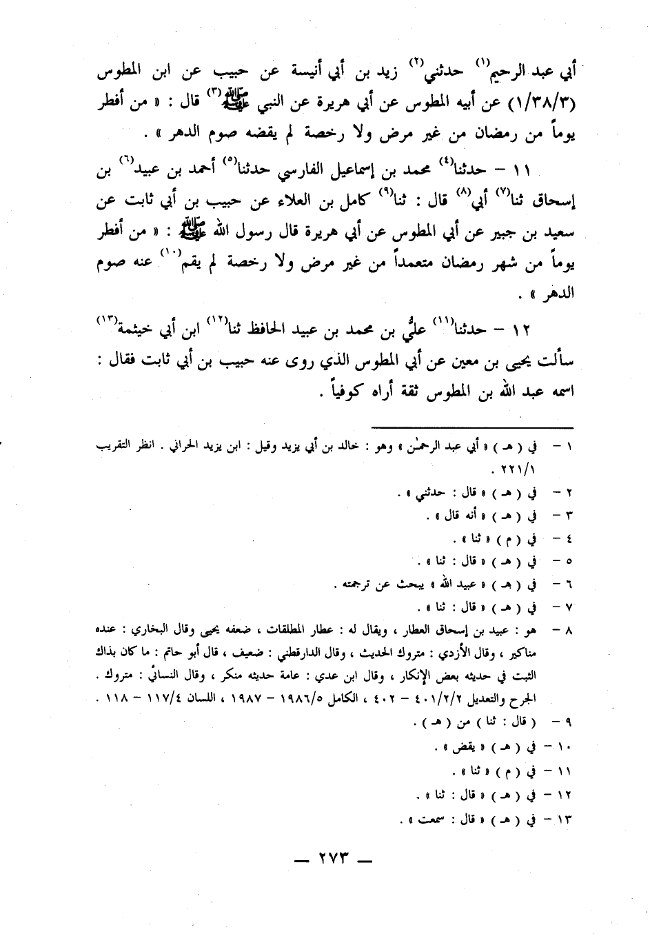 11- حَدَّثَنَا مُحَمَّدُ بْنُ إِسْمَاعِيلَ الْفَارِسِيُّ، حدثنا أحمد بن عبيد بن إسحاق، حدثنا أبي، قال: حدثنا كَامِلُ بْنُ الْعَلَاءِ، عَنْ حَبِيبِ بْنِ أَبِي ثَابِتٍ، عَنْ سَعِيدِ بْنِ جُبَيْرٍ، عَنْ أَبِي الْمُطَوِّسِ، عَنْ أَبِي هُرَيْرَةَ، قَالَ رَسُولُ اللَّهِ صَلَّى اللَّهُ عَلَيْهِ وَسَلَّمَ: مَنْ أَفْطَرَ يَوْمًا مِنْ شَهْرِ رَمَضَانَ مُتَعَمِّدًا مَنْ غَيْرِ مَرَضٍ، وَلَا رُخْصَةٍ، لَمْ يُقِمْ عَنْهُ صَوْمُ الدَّهْرِ.