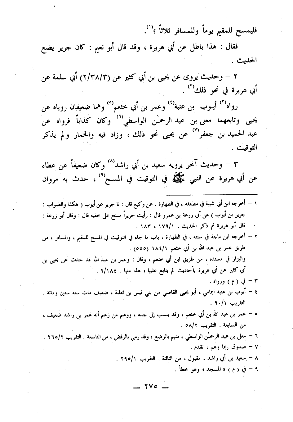 1563- وَسُئِلَ عَنْ أَحَادِيثَ رُوِيَتْ، عَنْ أَبِي هُرَيْرَةَ، عَنِ النَّبِيِّ صَلَّى اللَّهُ عَلَيْهِ وَسَلَّمَ فِي الْمَسْحِ عَلَى الْخُفَّيْنِ، مِنْهَا: حَدِيثٌ يَرْوِيهِ جَرِيرُ بْنُ أَيُّوبَ الْبَجَلِيُّ، عَنْ أَبِي زُرْعَةَ، عَنْ أبي هريرة، عن النبي صلى الله عليه وَسَلَّمَ: إِذَا أَدْخَلَ أَحَدُكُمْ قَدَمَيْهِ طَاهِرَتَيْنِ فَلْيَمْسَحْ لِلْمُقِيمِ يَومًا، وَلِلْمُسَافِرِ ثَلَاثًا.