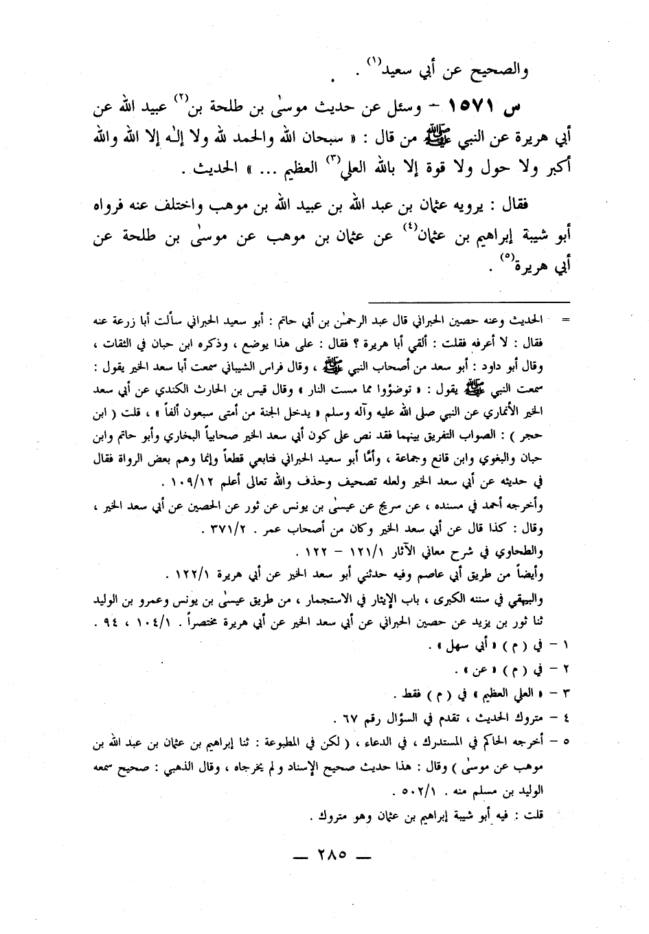 1571- وَسُئِلَ عَنْ حَدِيثِ مُوسَى بْنِ طَلْحَةَ بْنِ عُبَيْدِ اللَّهِ، عَنْ أَبِي هُرَيْرَةَ، عَنِ النَّبِيِّ صَلَّى اللَّهُ عَلَيْهِ وَسَلَّمَ: مَنْ قَالَ: سُبْحَانَ اللَّهِ، وَالْحَمْدُ للَّهِ، وَلَا إِلَهَ إِلَّا اللَّهُ، وَاللَّهُ أَكْبَرُ، وَلَا حَوْلَ وَلَا قُوَّةَ إِلَّا بِاللَّهِ الْعَلِّي الْعَظِيمِ، ... الْحَدِيثَ.