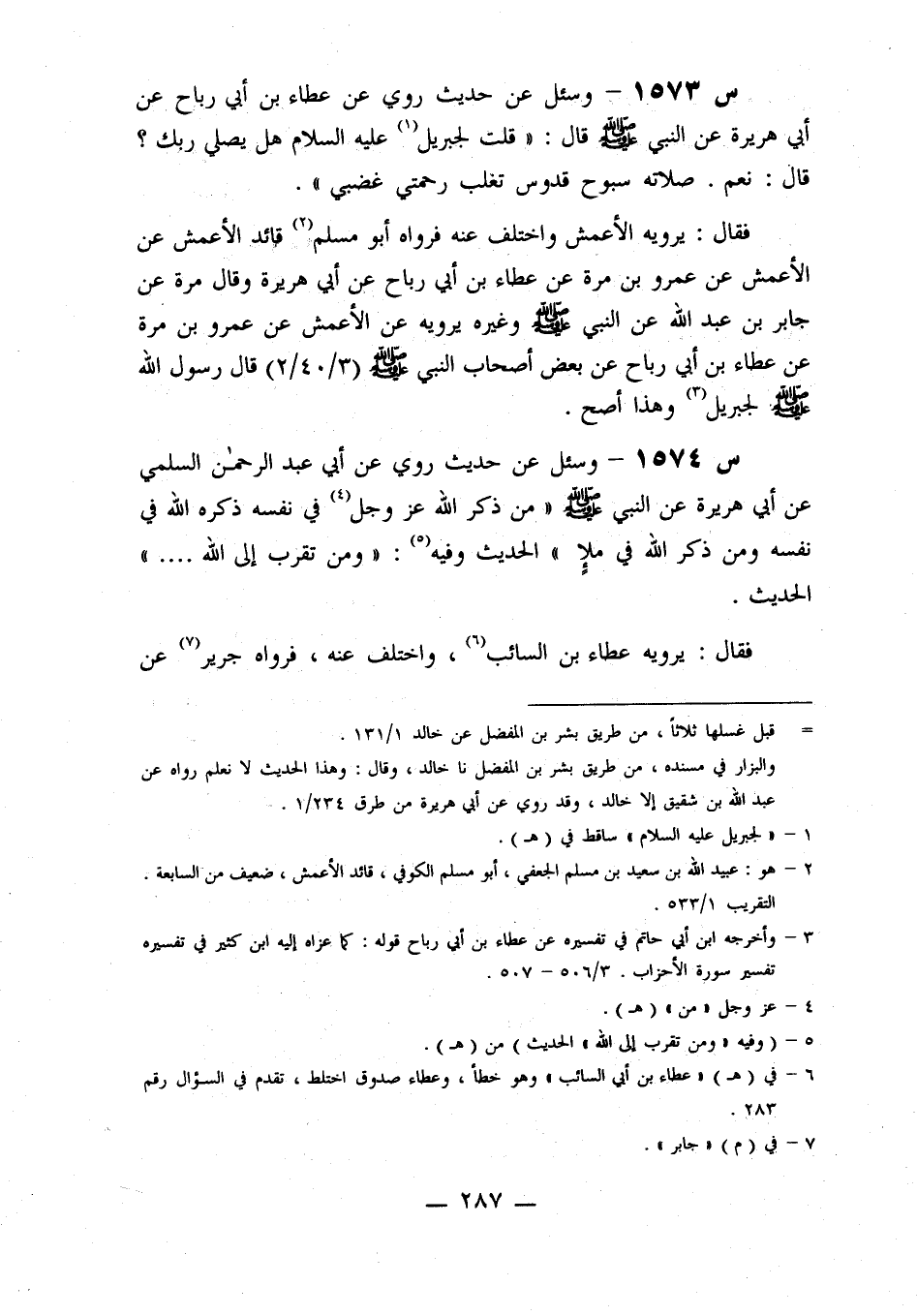 1573- وَسُئِلَ عَنْ حَدِيثٍ رُوِيَ عَنْ عَطَاءِ بْنِ أَبِي رَبَاحٍ، عَنْ أَبِي هُرَيْرَةَ، عَنِ النَّبِيِّ صَلَّى اللَّهُ عَلَيْهِ وَسَلَّمَ قَالَ: قُلْتُ لِجِبْرِيلَ عَلَيْهِ السَّلَامُ، هَلْ يُصَلِّي رَبُّكَ؟ قَالَ: نَعَمْ، صَلَاتُهُ سُبُّوحٌ قُدُّوسٌ تَغْلِبُ رَحْمَتِي غَضَبِي.