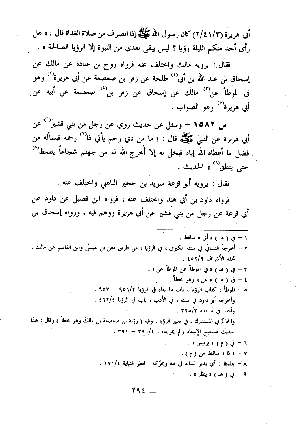 1581- وَسُئِلَ عَنْ حَدِيثٍ رَوِيَ عَنْ زُفَرَ بْنَ صَعْصَعَةَ، عَنْ أَبِي هُرَيْرَةَ، كَانَ رَسُولُ اللَّهِ صَلَّى اللَّهُ عَلَيْهِ وَسَلَّمَ: إِذَا انْصَرَفَ مِنْ صَلَاةِ الْغَدَاةِ، قَالَ: هَلْ رَأَى أَحَدٌ مِنْكُمُ اللَّيْلَةَ رُؤْيَا؟ لَيْسَ يَبْقَى بَعْدِي مِنَ النُّبُّوةِ، إِلَّا الرُّؤْيَا الصَّالِحَةُ.