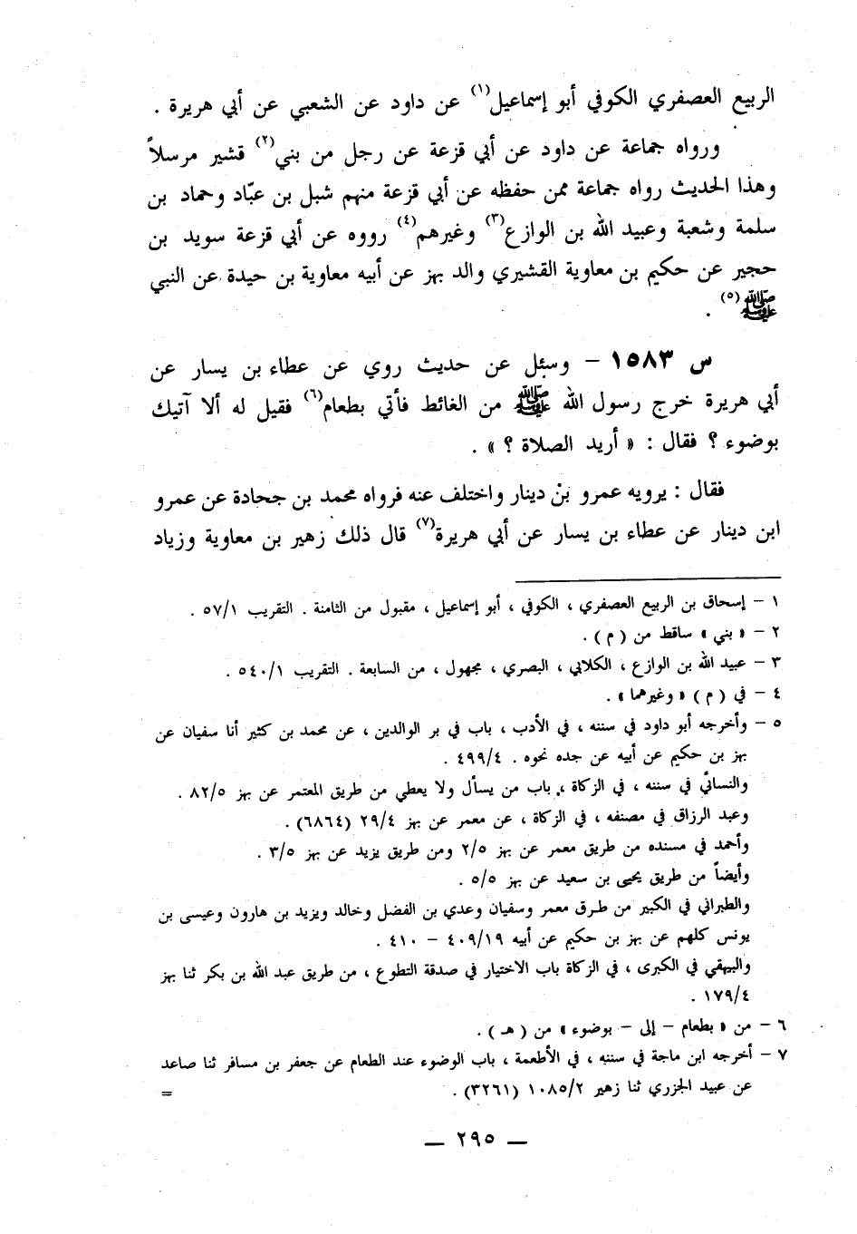 1583- وَسُئِلَ عَنْ حَدِيثٍ رُوِيَ عَنْ عَطَاءِ بْنِ يَسَارٍ، عَنْ أَبِي هُرَيْرَةَ، خَرَجَ رَسُولُ اللَّهِ صَلَّى اللَّهُ عَلَيْهِ وَسَلَّمَ مِنَ الْغَائِطِ، فَأُتِيَ بِطَعَامٍ، فَقِيلَ لَهُ: أَلَا آتِيكَ بِوُضُوءٍ؟ فَقَالَ: أُرِيدُ الصَّلَاةَ؟.