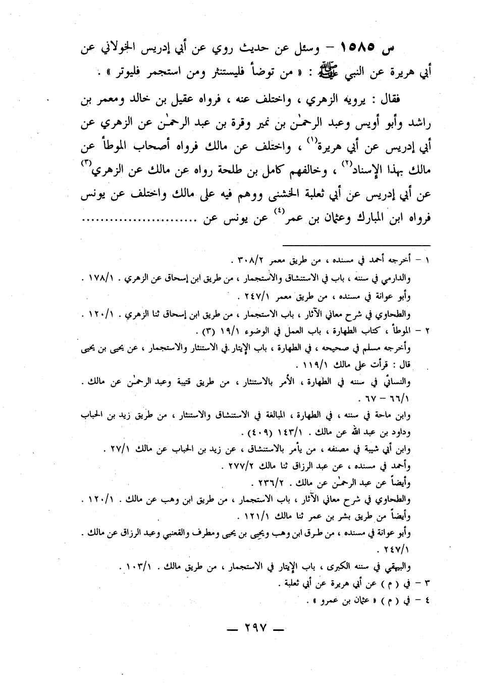 1585- وَسُئِلَ عَنْ حَدِيثٍ رُوِيَ عَنْ أَبِي إِدْرِيسَ الْخَوْلَانِيِّ، عَنْ أَبِي هُرَيْرَةَ، عَنِ النَبِيِّ صَلَّى اللَّهُ عَلَيْهِ وَسَلَّمَ: مَنْ تَوَضَّأَ، فَلْيَسْتَنْثِرْ، وَمَنِ اسْتَجْمَرَ، فَلْيُوتِرْ.