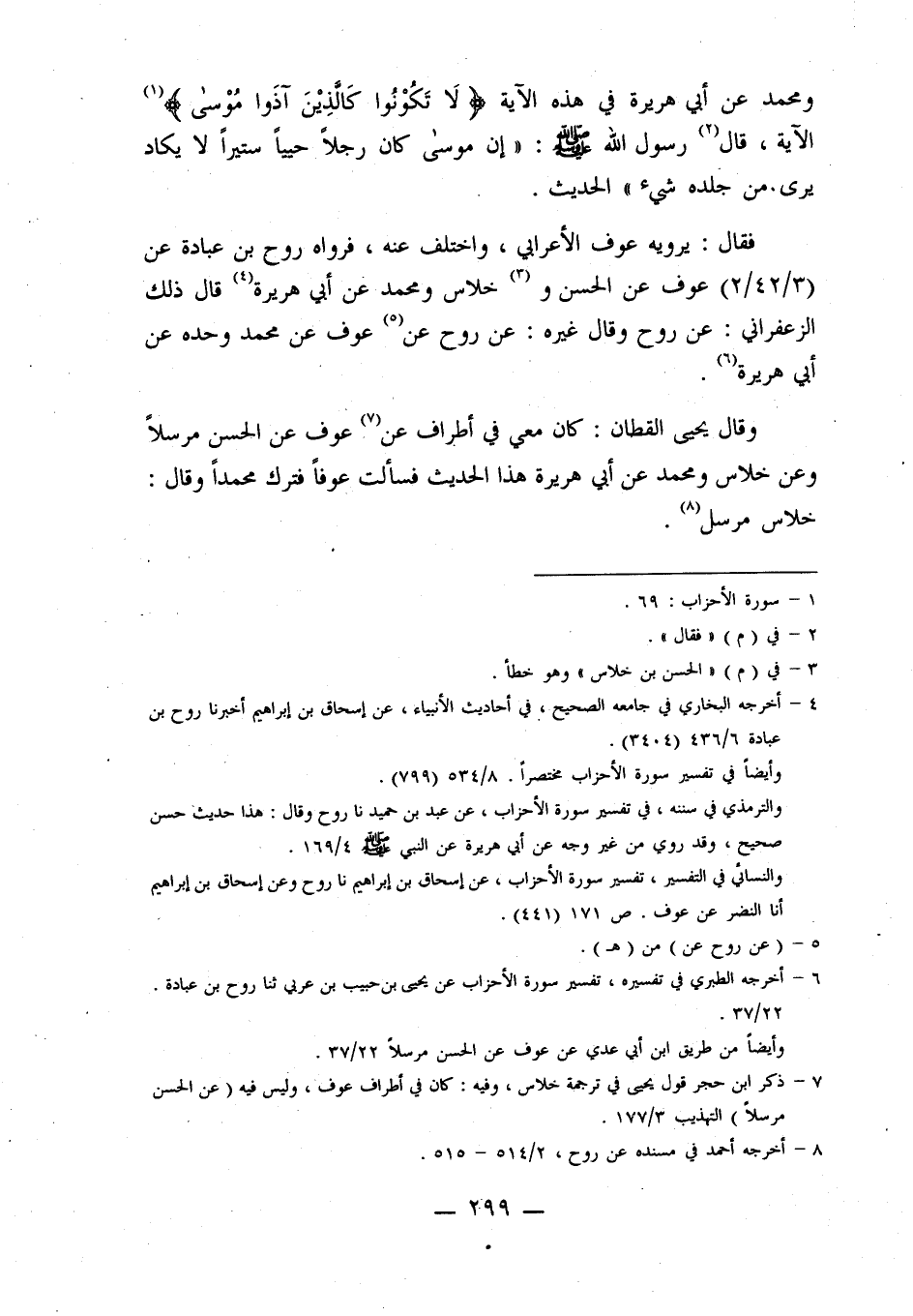 1586- وَسُئِلَ عَنْ حَدِيثِ عَوْفٍ، عَنْ خِلَاسٍ، وَالْحَسَنُ وَمُحَمَّدٌ، عَنِ أَبِي هُرَيْرَةَ فِي هَذِهِ الْآيَةِ: {لا تكونوا كالذين آذوا موسى} ، الْآيَةَ، قَالَ رَسُولُ اللَّهِ صَلَّى اللَّهُ عَلَيْهِ وَسَلَّمَ: إِنَّ مُوسَى كَانَ رَجُلًا حَيِيًّا سِتِّيرًا لَا يَكَادُ يُرَى مِنْ جِلْدِهِ شَيْءٌ ... الْحَدِيثَ.
