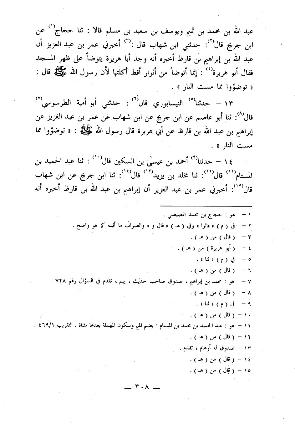 13- حَدَّثَنَا النَّيْسَابُورِيُّ، قَالَ: حَدَّثَنِي أَبُو أُمَيَّةَ الطَّرْسُوسِيُّ، قال: حدثنا أَبُو عَاصِمٍ، عَنِ ابْنِ جُرَيْجٍ، عَنِ ابْنِ شِهَابٍ، عَنْ عُمَرَ بْنِ عَبْدِ الْعَزِيزِ، عَنْ إِبْرَاهِيمَ بْنِ عَبْدِ اللَّهِ بْنِ قَارِظٍ، عَنْ أبي هريرة، قال رسول الله صلى الله عليه وسلم: توضؤوا مِمَّا مَسَّتِ النَّارُ.
