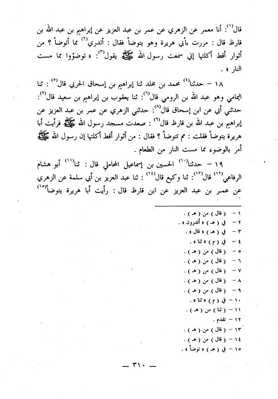 18- حدثنا محمد بن مخلد، حدثنا إبراهيم بن إسحاق الحربي، قال: حدثنا الْيَمَامِيُّ وَهُوَ عَبْدُ اللَّهِ بْنُ الرُّومِيُّ، قَالَ: حدثنا يعقوب بن إبراهيم بن سعد (1) ، قَالَ: حَدَّثَنِي أَبِي، عَنِ ابْنِ إِسْحَاقَ، قَالَ: حَدَّثَنِي الزُّهْرِيِّ، عَنْ عُمَرَ بْنِ عَبْدِ الْعَزِيزِ، عَنْ إِبْرَاهِيمَ بْنِ عَبْدِ اللَّهِ بْنِ قَارِظٍ، قَالَ: صَعِدْتُ مَسْجِدَ رَسُولِ اللَّهِ صَلَّى اللَّهُ عَلَيْهِ وَسَلَّمَ، فَرَأَيْتُ أَبَا هُرَيْرَةَ يَتَوَضَّأُ، فَقُلْتُ: مِمَّ تَتَوَضَّأُ؟ فَقَالَ: مِنْ أَثْوَارِ أَقِطٍ أَكَلْتُهَا، أن رسول الله صلى الله عليه وسلم: أَمَرَ بِالْوُضِوءِ مِمَّا مَسَّتِ النَّارُ مِنَ الطَّعَامِ.